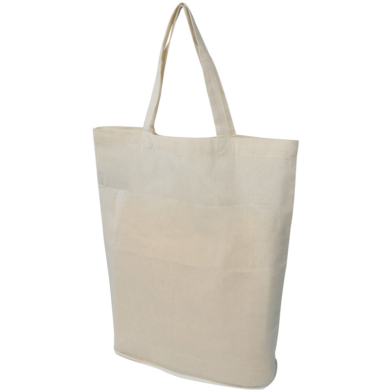 Oeko-Tex® STANDARD 100 zertifizierte, naturfarbene, faltbare Baumwolltasche (Grammatur 140 g / m²) mit Tragehenkeln. Der Werbeaufdruck erfolgt auf einer Seite der Tasche im offenen Zustand.