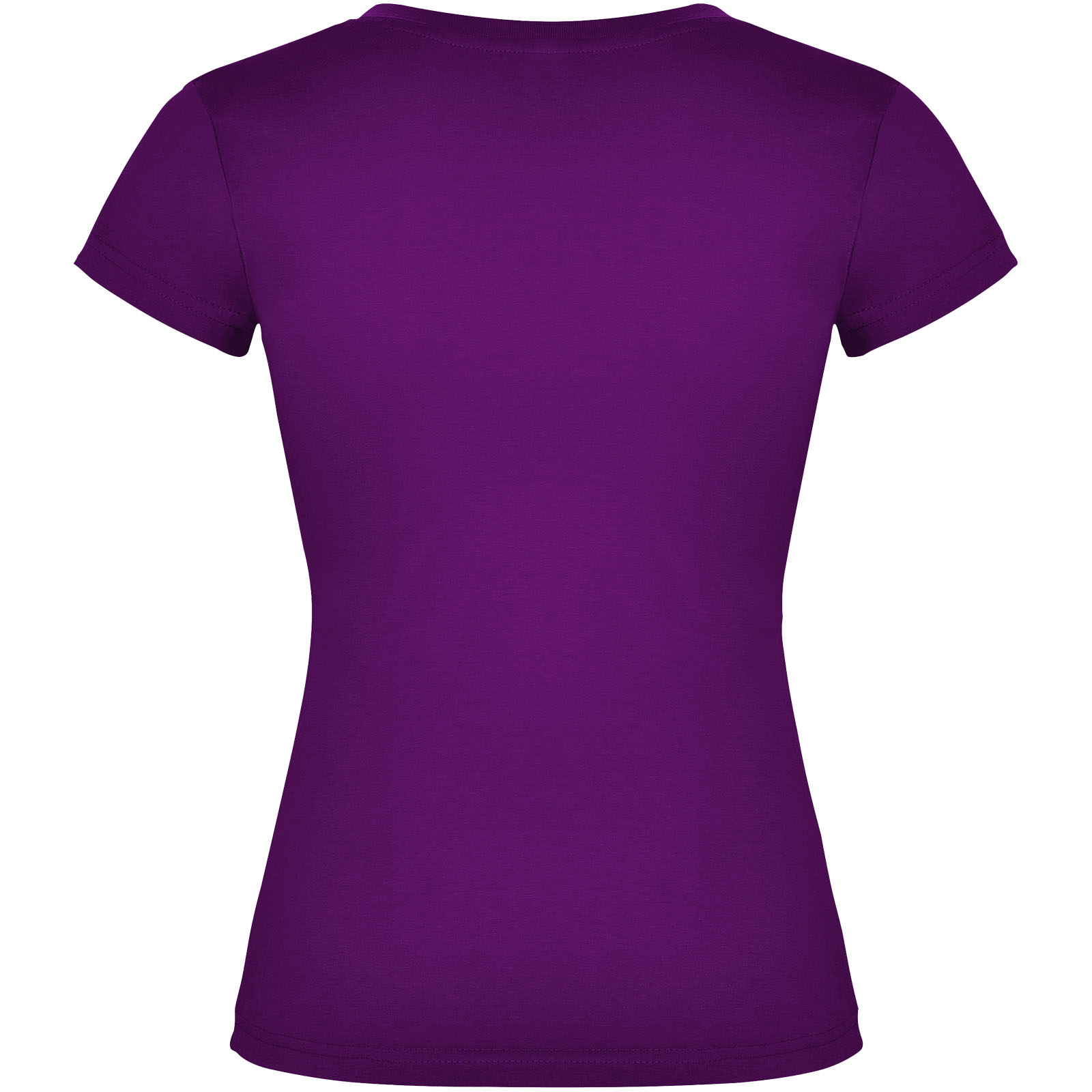 Kurzärmeliges T-Shirt für Damen mit V-Ausschnitt und 1×1-Rippstrickbündchen. Schmale Passform mit Seitennaht. Herausnehmbares Etikett. Das Modell ist 174 cm groß und trägt Größe S.