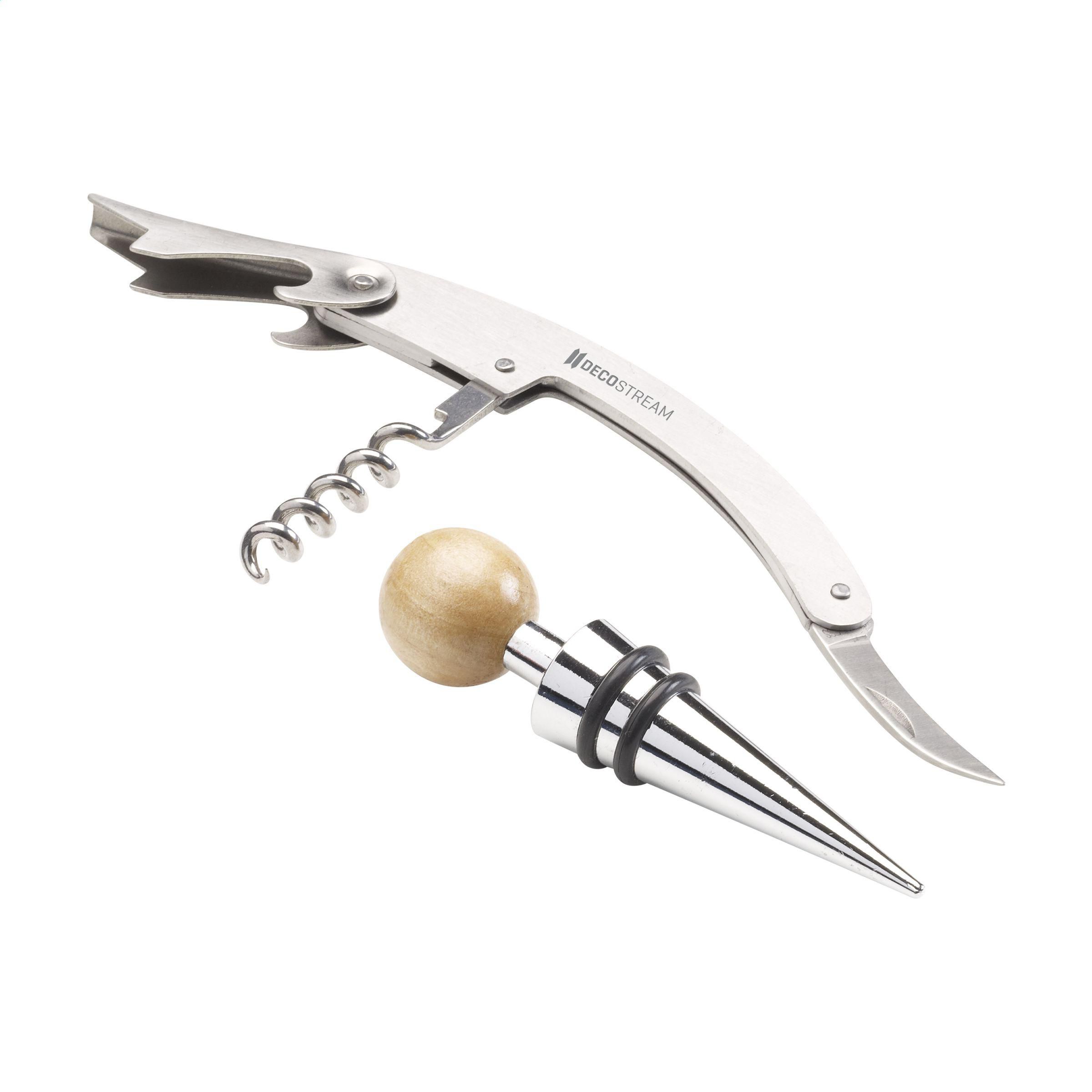 2-teiliges Weingeschenkset: Kellnermesser aus Mattstahl und Flaschenverschluss mit Holzknopf. Pro Set in einer Verpackung.