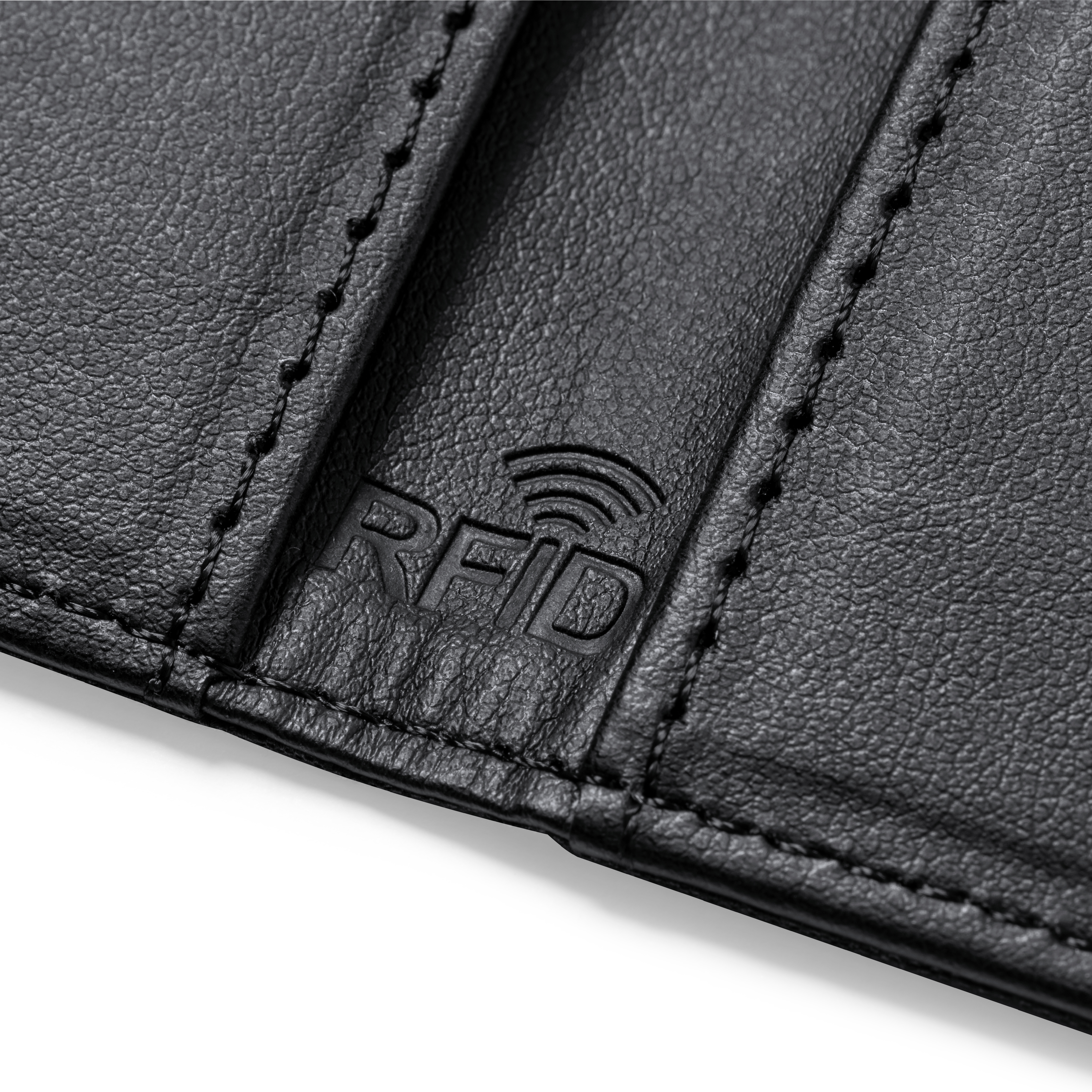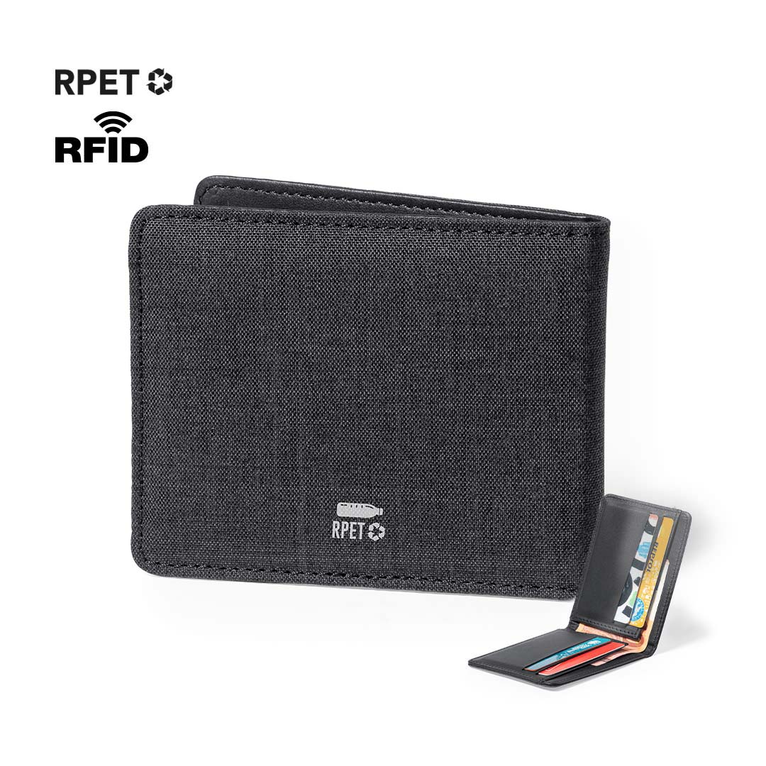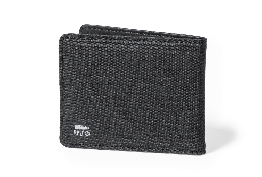 Elegantes Portemonnaie und Kartenetui aus RPET-Polyester mit schwarzem Finish. Innen mit 6 unabhängigen Fächern für Karten und große Brieftasche. RFID (Radio Frequency Identification) Sicherheitstechnologie, die die Kartendaten sicher hält. Mit der Besonderheit von RPET außen und dem RIFD innen. RPET-Material wird aus recyceltem Kunststoff hergestellt, um die Wiederverwendung von Kunststoffabfällen zu fördern und die Nachhaltigkeit des Planeten zu unterstützen.