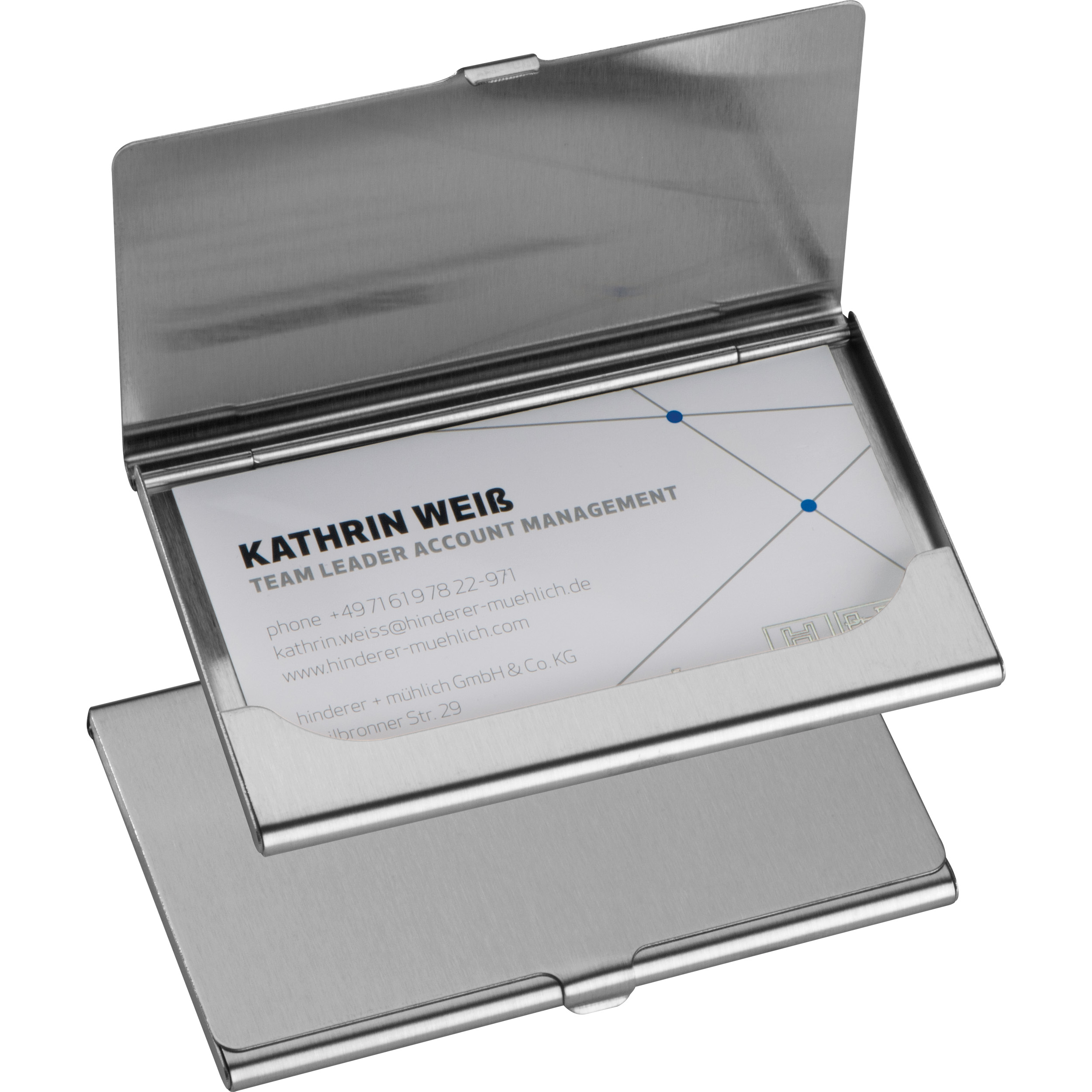 Visitenkartenetui aus Metall. Dieses robuste Etui schützt Ihre Karten vor Beschädigungen. Der Deckel bietet ausreichend Platz für eine Lasergravur.