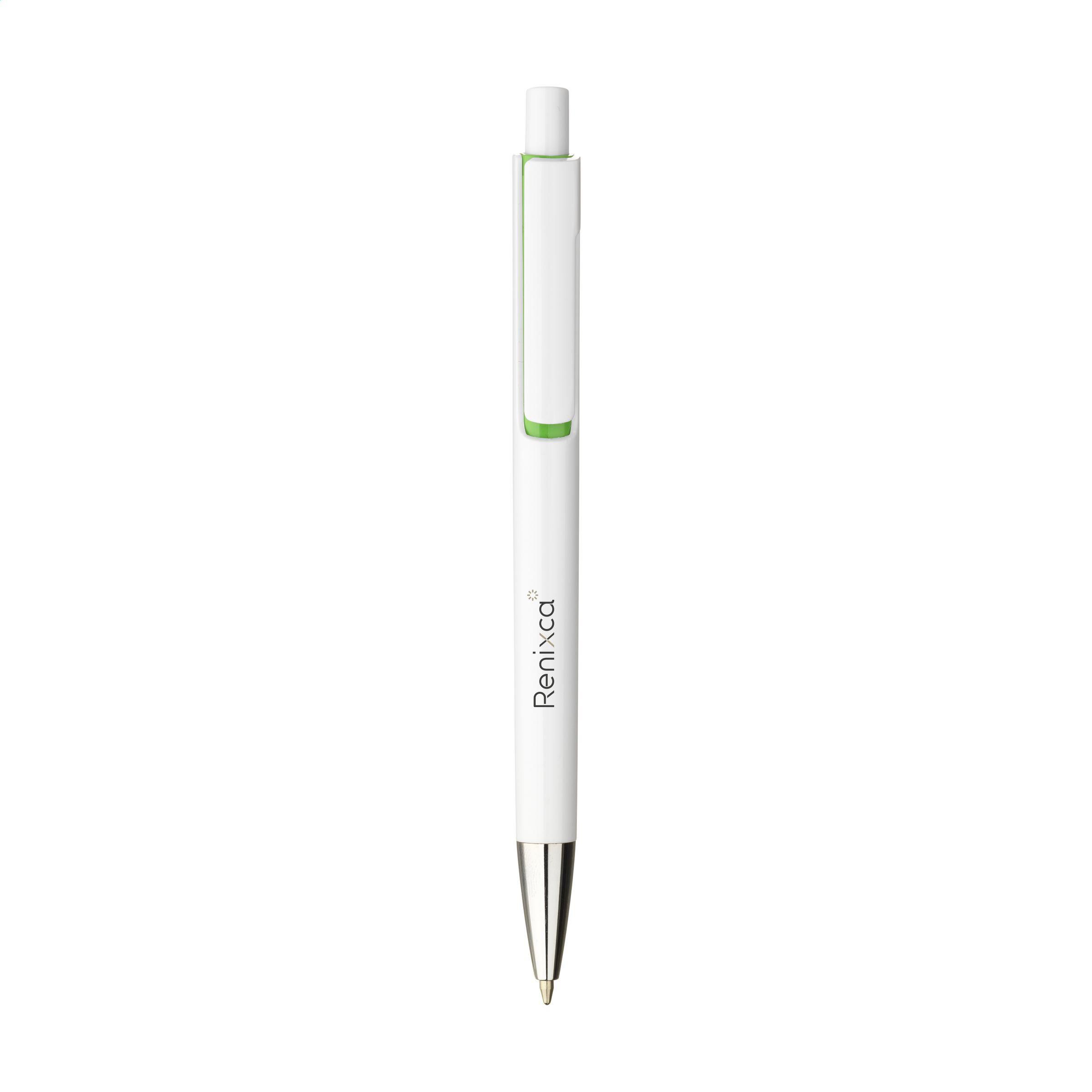 Beschreibung: Blauschreibender Kugelschreiber mit einem Gehäuse aus recyceltem ABS. Mit einzigartigem Design: das Gehäuse und der Clip von diesem Kugelschreiber sind aus 'einem Guss', was diesen Kugelschreiber zu einem besonderen Blickfang macht. Mit auffallendem Farbakzent unter dem GRS-zertifiziert.