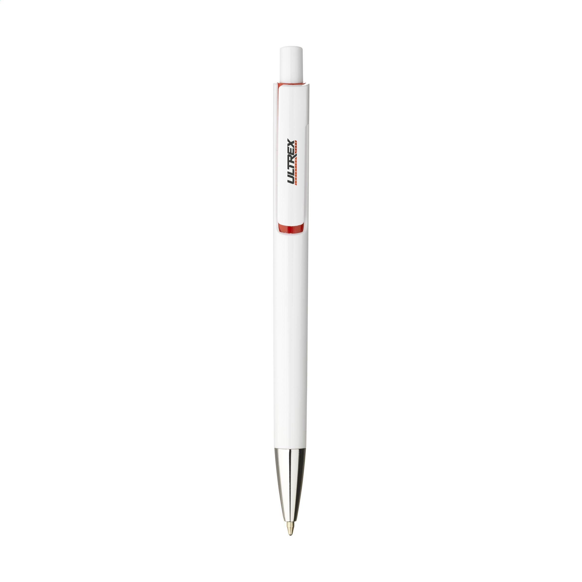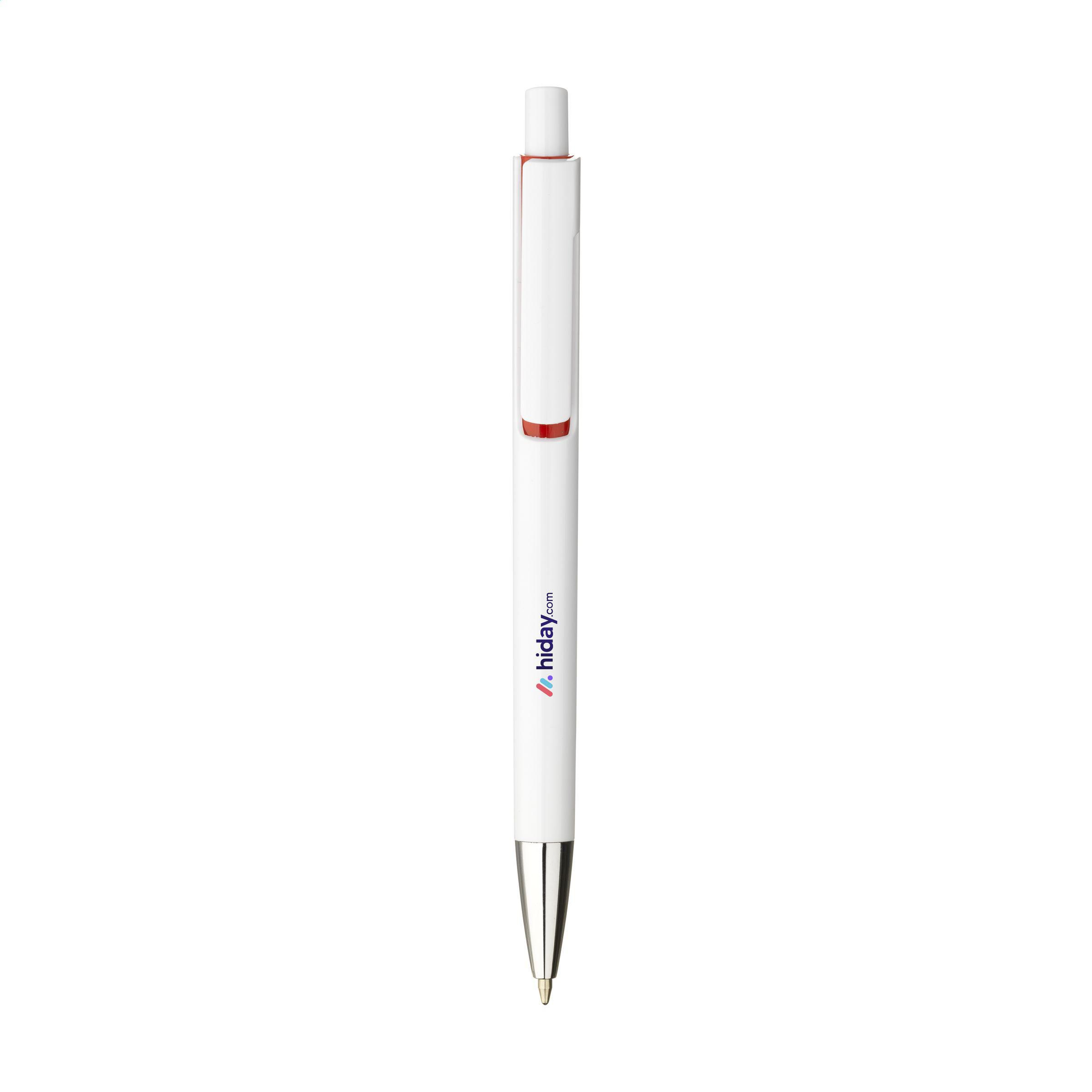 Beschreibung: Blauschreibender Kugelschreiber mit einem Gehäuse aus recyceltem ABS. Mit einzigartigem Design: das Gehäuse und der Clip von diesem Kugelschreiber sind aus 'einem Guss', was diesen Kugelschreiber zu einem besonderen Blickfang macht. Mit auffallendem Farbakzent unter dem GRS-zertifiziert.
