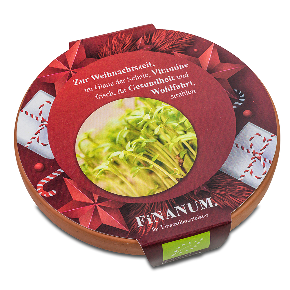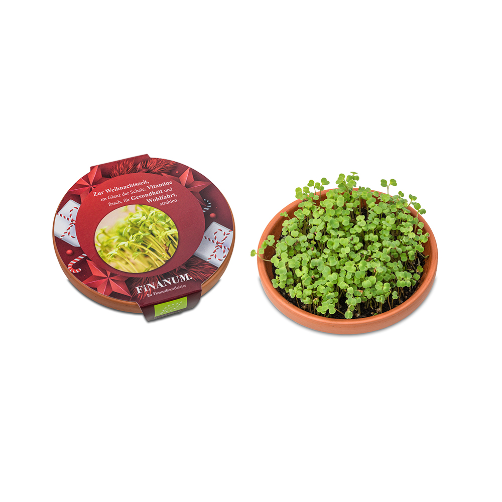 In einer Welt voller Stress und Hektik ist es wichtiger denn je, sich um seine Gesundheit zu kümmern. Superfoods, reich an lebenswichtigen Vitaminen und Mineralstoffen, spielen dabei eine entscheidende Rolle. Diese Nährstoffbomben stärken das Immunsystem, fördern die Vitalität und unterstützen ein gesundes Leben. Unsere Vitaminschale bietet eine einfache Möglichkeit, Superfoods in Bio-Qualität Zuhause anzubauen und täglich eine Extraportion Gesundheit zu genießen. Die Schale ist aus hochwertigem Terrakotta mit 11 cm Durchmesser. Geliefert wird eine Substrattablette und Bio-Samen, der für mehr als einen Pflanzvorgang reicht. Zur Auswahl stehen die Samensorten Salatrauke, Rettich China Rose, Radies Sango und Kresse. Die individuelle Banderole bietet eine große Werbefläche.