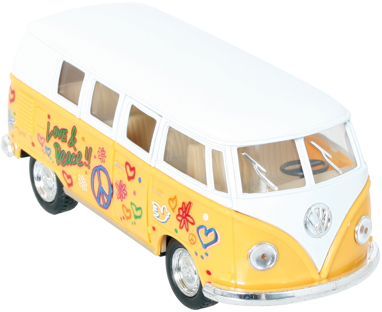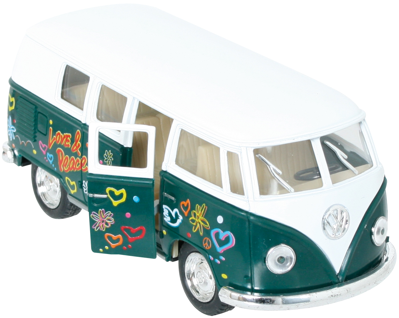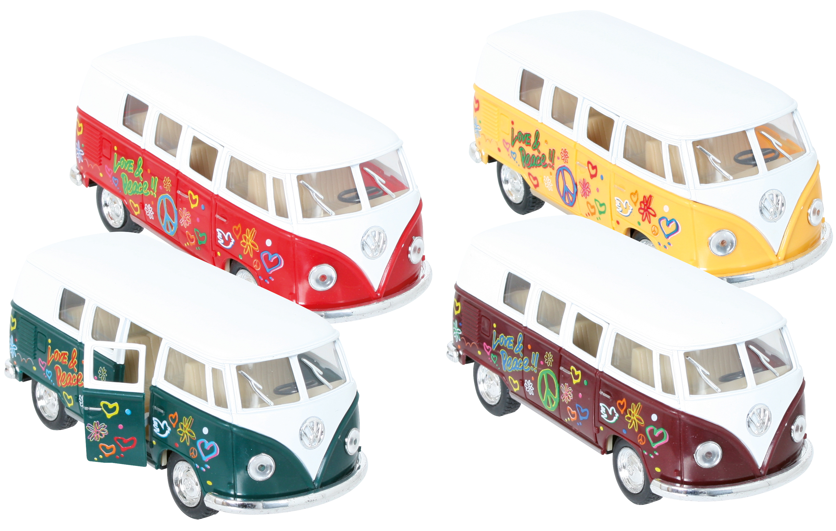 Retro-Bus aus Kunststoff mit Gummireifen und Rückzugmotor. Die Türen kann man öffnen. Verschiedene Farben sortiert.