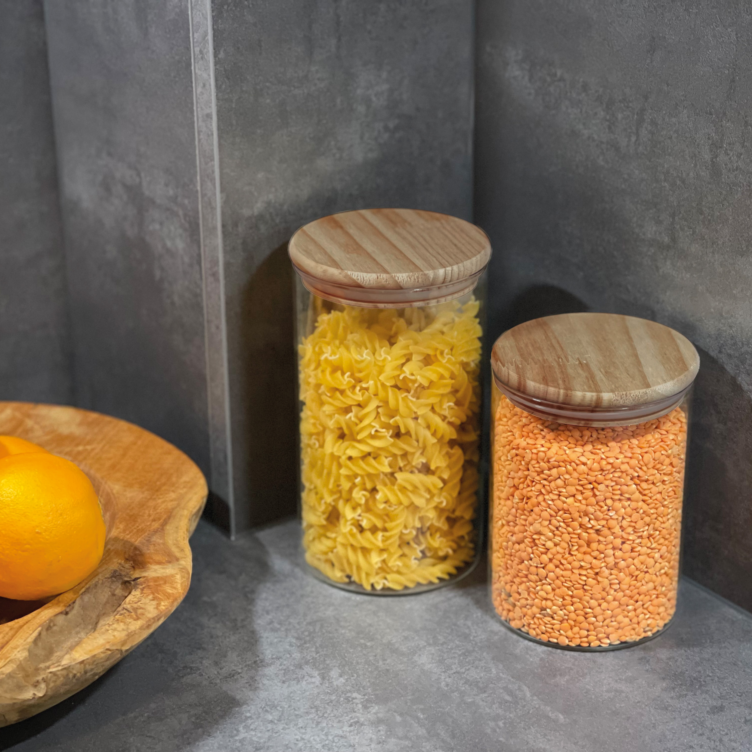 Vorratsdose aus Borosilikatglas mit Bambusdeckel und Silikonring. Mit einem Füllvermögen von 700 ml darf dieses Aufbewahrungsglas in keiner Küche fehlen. Ihre Werbung lasern wir auf den Bambusdeckel.