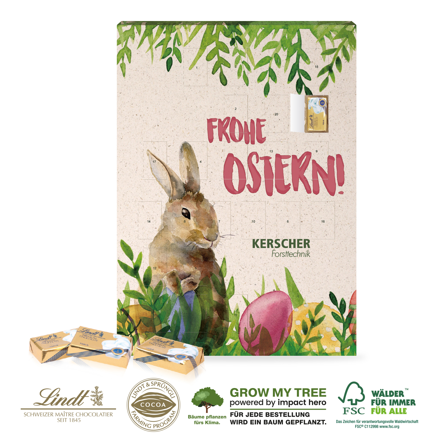 Große Freude schenken! Mit 20 Türchen bis Ostern ist der Kalender ein echter Hingucker und ein ganz besonderes Präsent. Gefüllt mit feinster Lindt Schokolade und rundum individuell bedruckt, ein echtes Highlight.