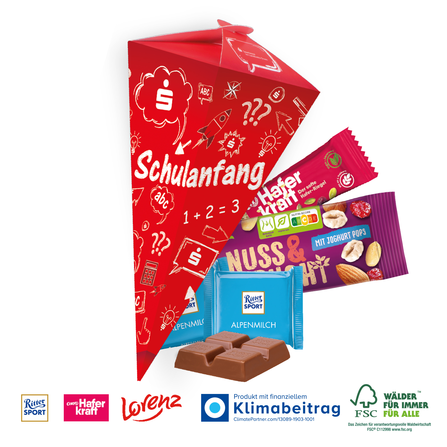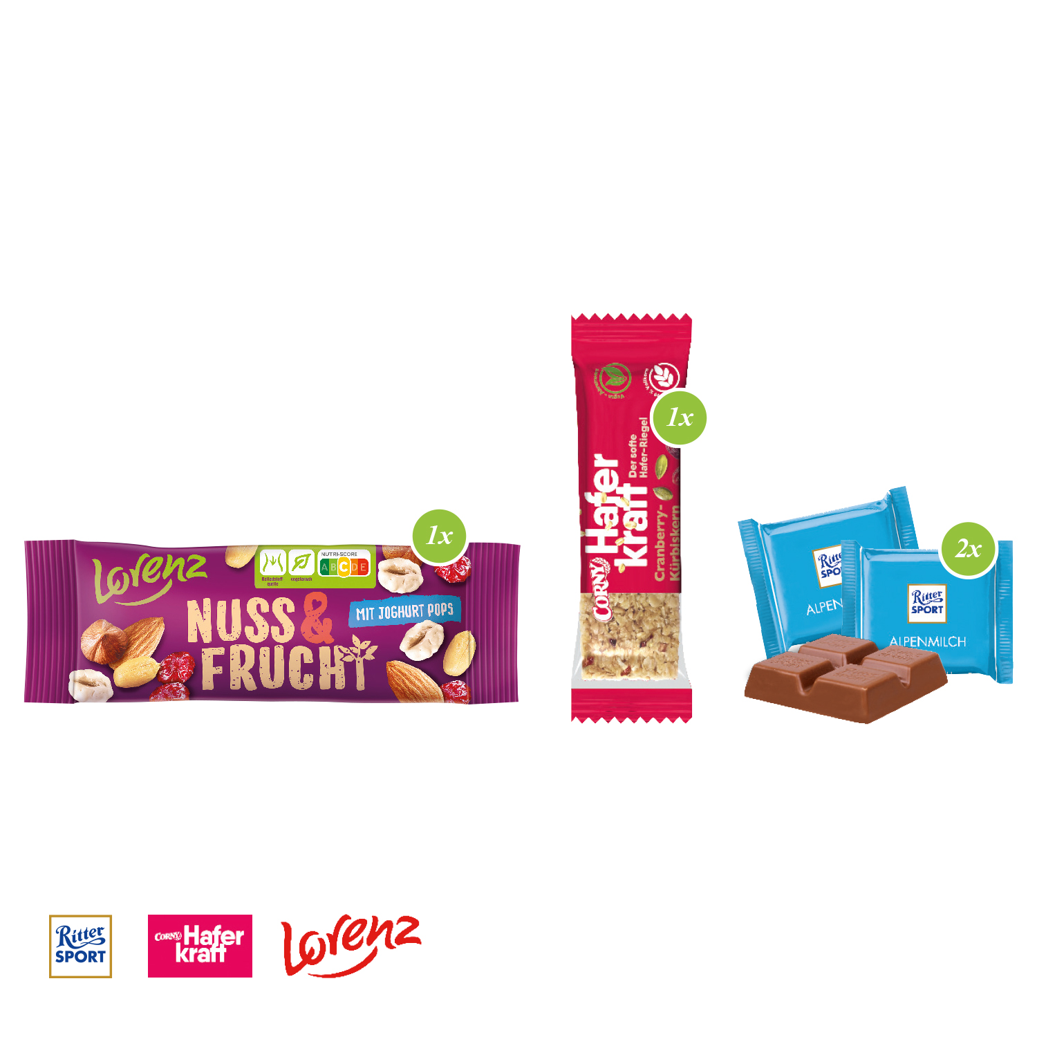 1 Haferriegel Cranberry-Kürbiskern (ca. 35 g) von CORNY, 1 Lorenz Nuss & Frucht (ca. 40 g), Ritter SPORT Mini (ca. 33 g, Alpenmilch).