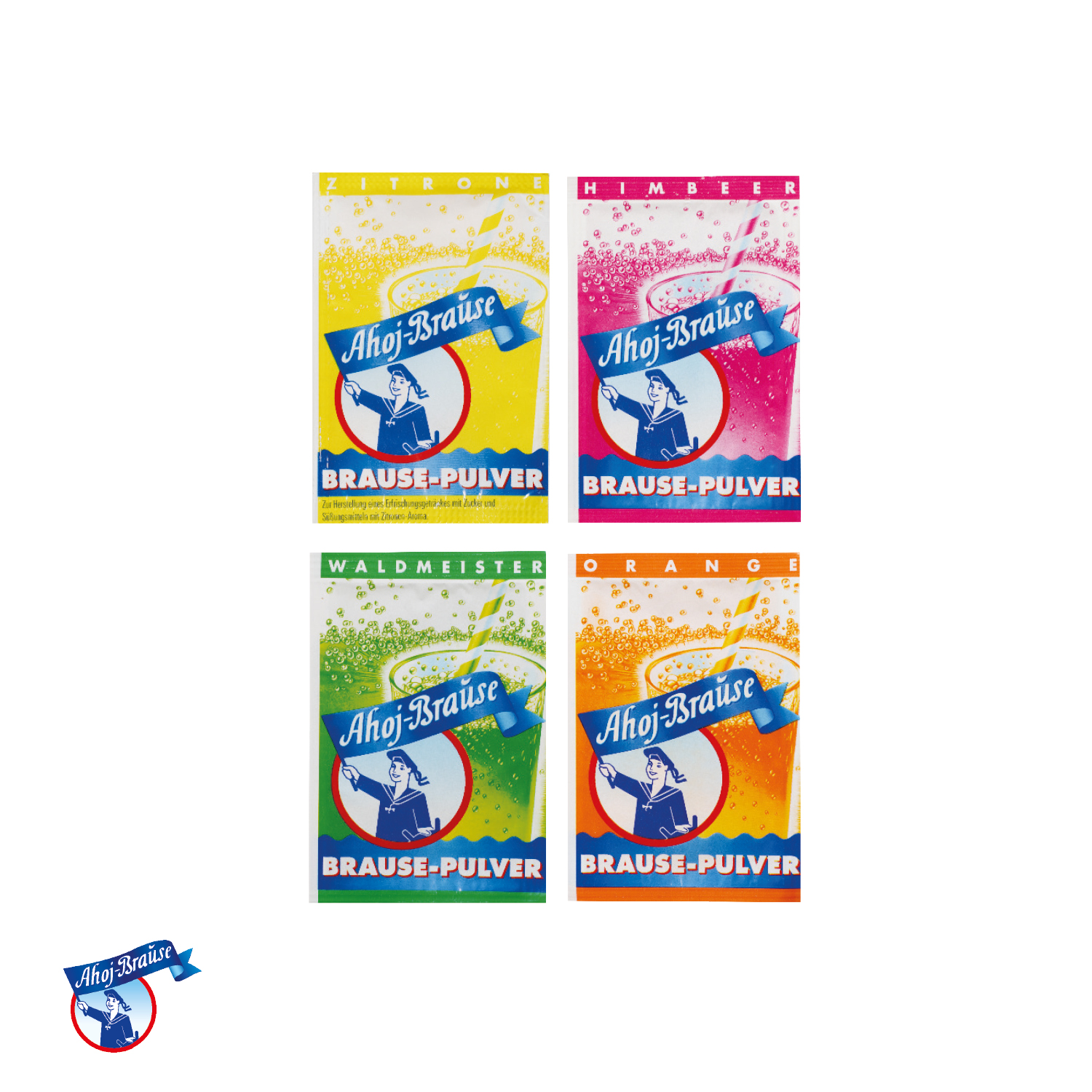 1 Ahoj-Brause Brause-Pulver. Geschmacksrichtungen Waldmeister, Orange, Zitrone und Himbeere bunt gemischt.