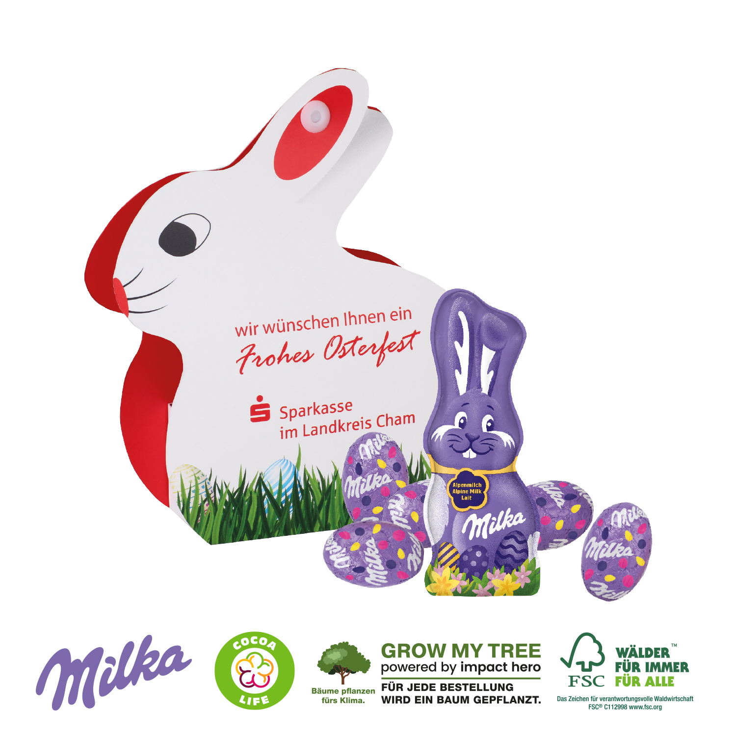 Sympathische Kundenbindung zum attraktiven Preis! Werbe-Osterei oder Werbe-Hase als Tischaufsteller, gefüllt mit Premium-Markenschokolade. Mit seinem perfekten Format findet es Platz auf jedem Schreibtisch!