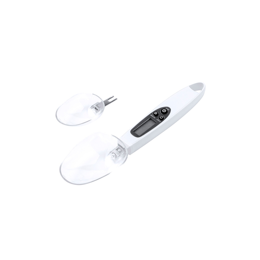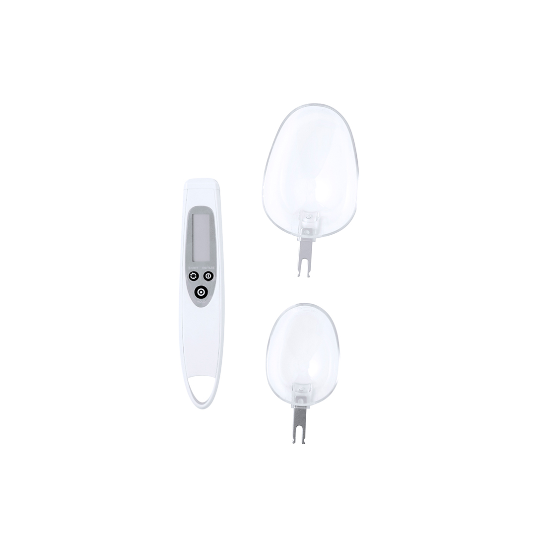 Praktische Digitalwaage mit Löffel, gültig für Flüssigkeiten und Feststoffe. Mit 2 austauschbaren Löffeln und LCD-Digitalanzeige im Griff, die das Gewicht mit einer Genauigkeit von 0,1 g anzeigt. Taste zur Anzeige des Gewichts in Gramm (g), Unzen (oz) oder Milliliter (ml), mit Speicherfunktion und der Möglichkeit, zwei Zutaten zu wiegen. Beide Löffel sind mit einer zusätzlichen Messskala für Flüssigkeiten versehen: der kleine Löffel von 5 ml bis 25 ml und der große Löffel von 10 ml bis 50 ml. Mit Gebrauchsanweisung in Englisch und Spanisch. Betrieben mit Knopfzellenbatterie (im Lieferumfang enthalten) und einzeln in einer Kraft-Design-Box präsentiert.