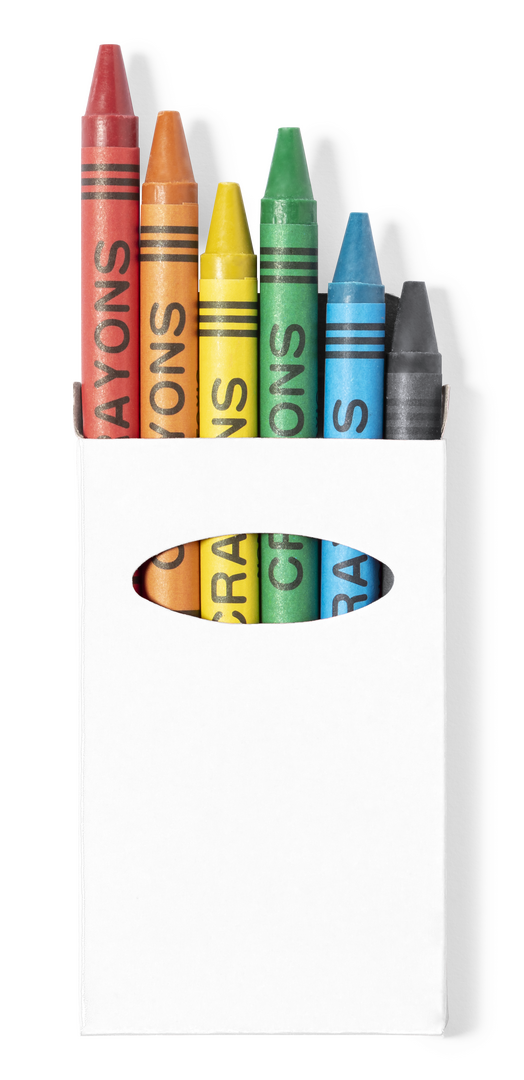Set aus 6 Wachsmalstiften in einer Schachtel aus glänzendem Karton in lebendigen Farben mit Fenster. Mit zylinderförmigem Körper in verschiedenen Farben. In den Farben Rot, Grün, Gelb, Blau, Schwarz und Orange.