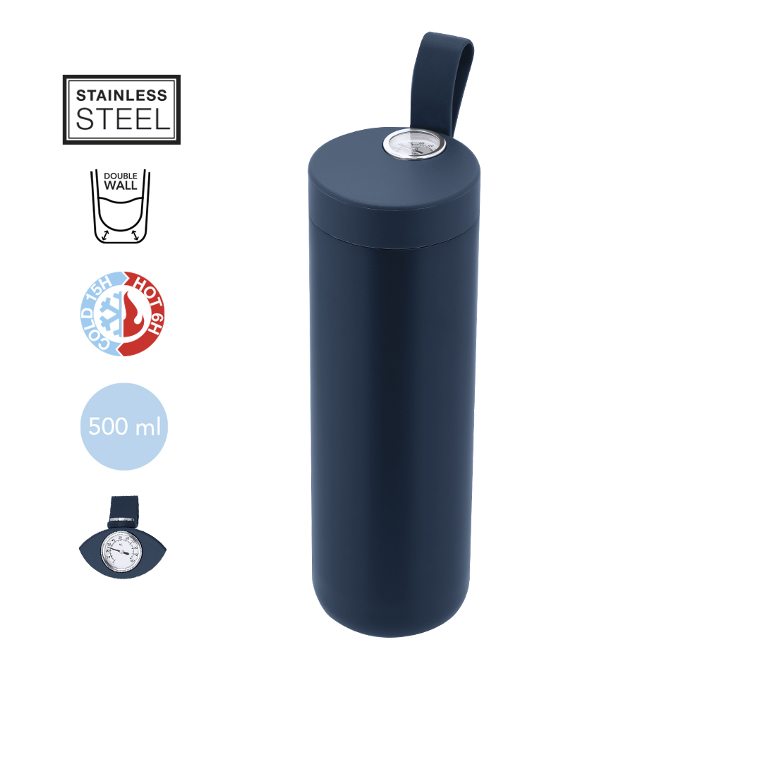 Thermobecher aus Edelstahl mit doppelter Wand und einer Kapazität von 500 ml mit analogem Temperaturmessgerät im Bereich von 0º bis 100º. Mit Sicherheitsverschluss, integriertem Silikon-Griff und passendem Gehäuse. BPA-frei.