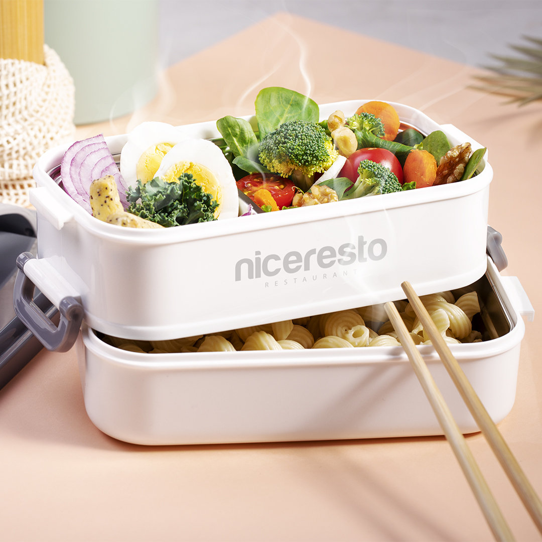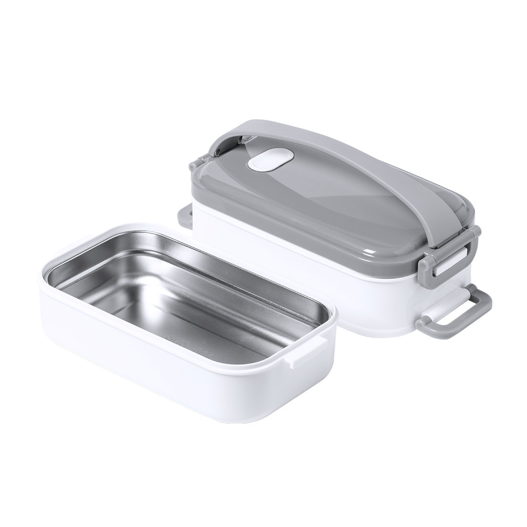 Thermo-Lunchbox mit 850 ml Fassungsvermögen. Hergestellt aus rostfreiem Stahl und PP, BPA-frei. Enthält 2 unabhängige Fächer mit Edelstahlschalen und hermetischer Versiegelung, 500 ml bzw. 350 ml Fassungsvermögen. Ideal für eine gute Wärmespeicherung mit der Möglichkeit, diese durch Zugabe von heißem Wasser zu verlängern.
