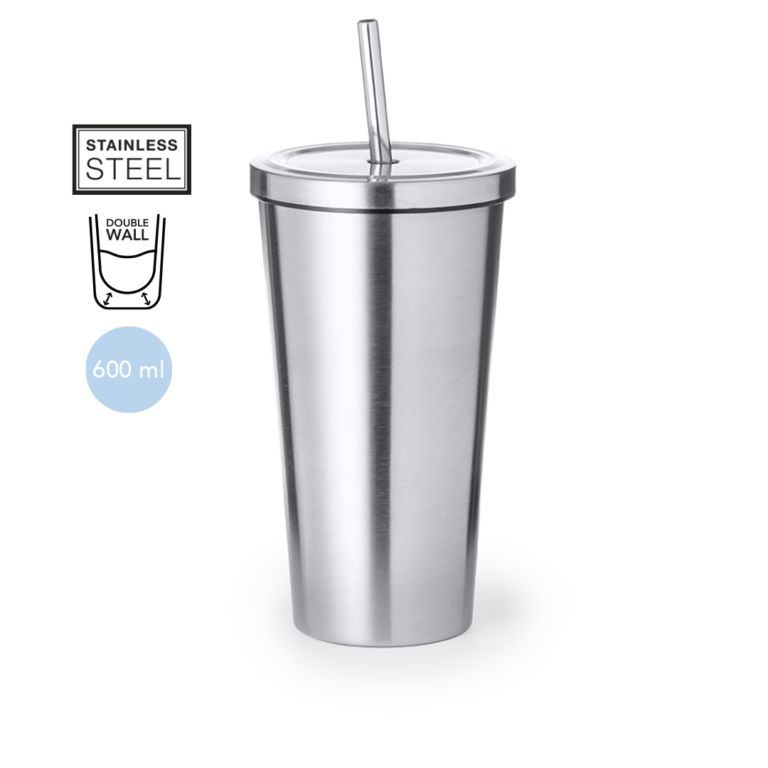 Stilvoller doppelwandiger Thermobecher aus Edelstahl mit 600 ml Fassungsvermögen. Mattes Finish, mit Schraubdeckel und passendem Strohhalm. Präsentiert in einer individuellen Kraft-Design-Box.