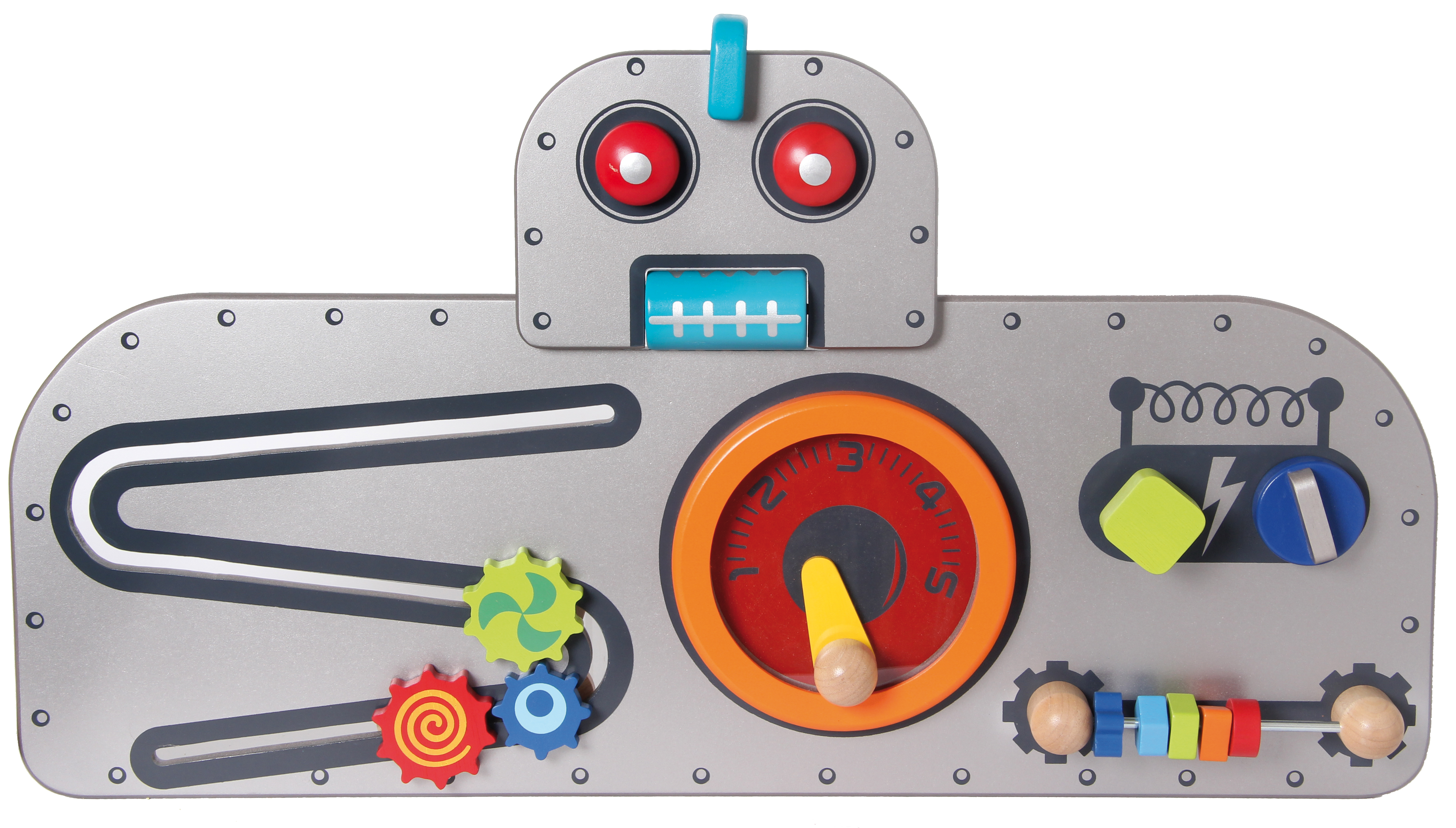 Das futuristische Motorikspiel ist ein tolles Accessoire für Kinderzimmer, Warteräume oder Kinderkrippen. Es bietet einen Drehzylinder, rollende Zahnräder, einen beweglichen Zeiger, einen knatternden Drehschalter, eine Schraube und ein Zählspiel. Der freundliche Roboter regt die Kinder zum Spielen und Lernen an. Gefertigt aus nachhaltig produziertem Gummibaumholz und lackiert mit gesundheitlich unbedenklichen Farben.