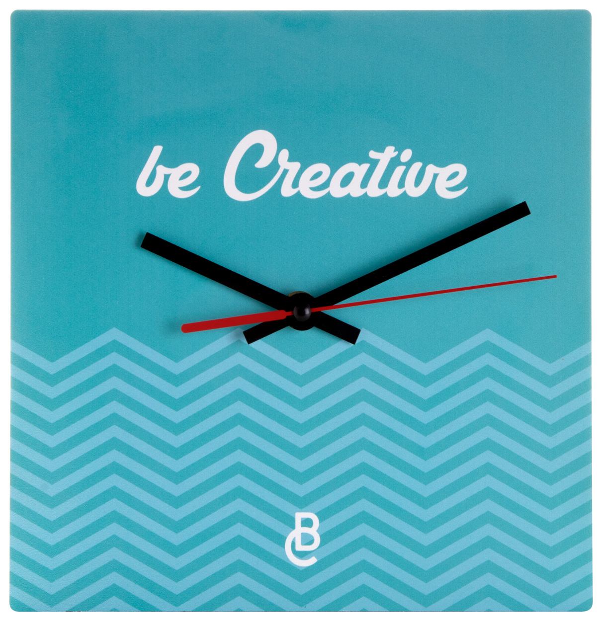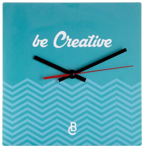 Quadratische Wanduhr aus Holz mit Vollfarbdruck. Preis inkl. UV LED Druck. Exkl. Batterie (1 x AA). Mindestmenge: 50 Stk.