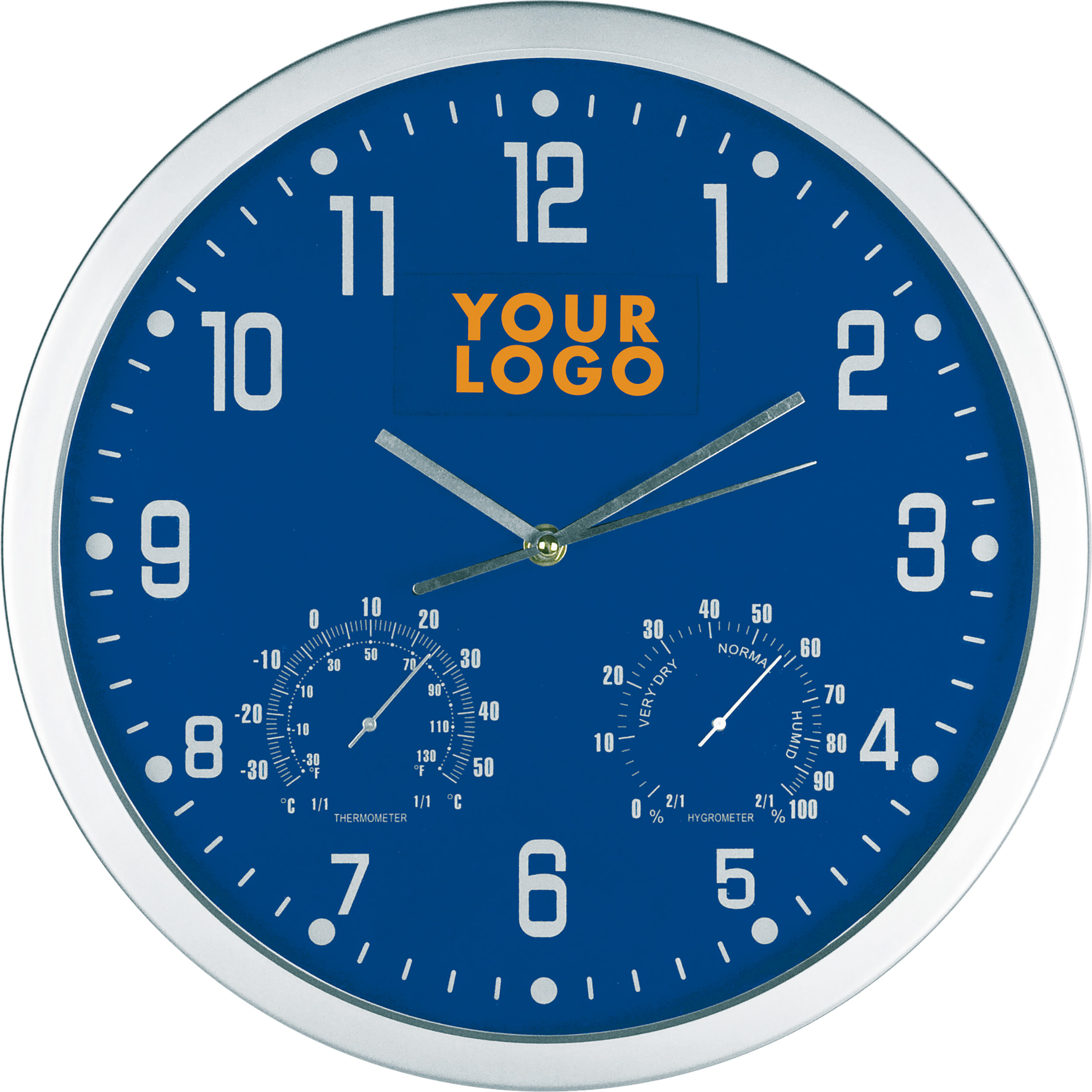 Schick und schlicht - somit ideal für Ihre Werbung ist diese Wanduhr mit Hygrometer und Thermometer. Ihre Werbung wird auf dem Werbeplättchen unterhalb der Zwölf angebracht.