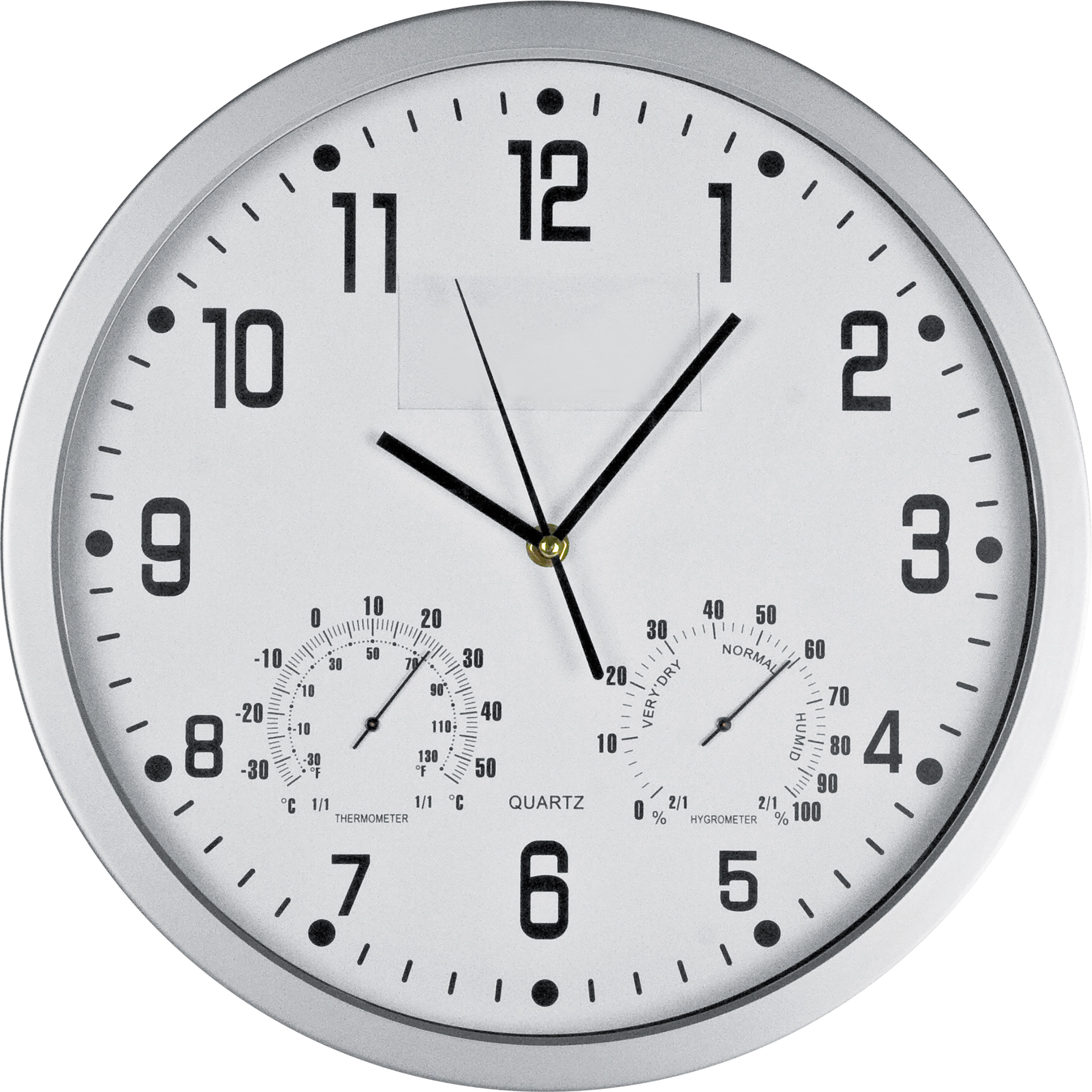 Schick und schlicht - somit ideal für Ihre Werbung ist diese Wanduhr mit Hygrometer und Thermometer. Ihre Werbung wird auf dem Werbeplättchen unterhalb der Zwölf angebracht.