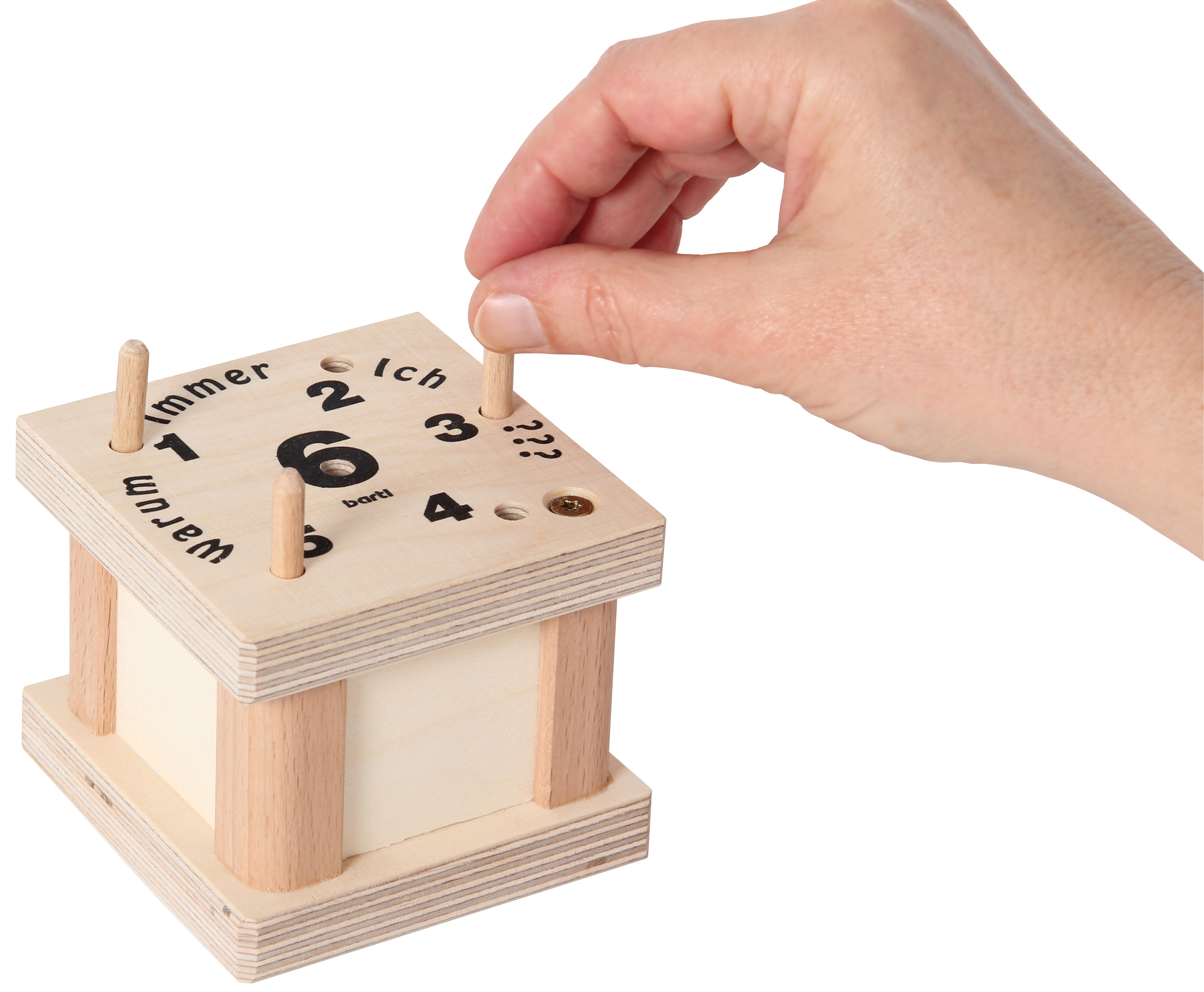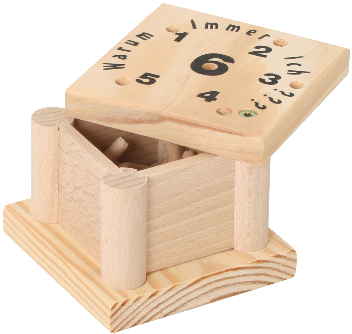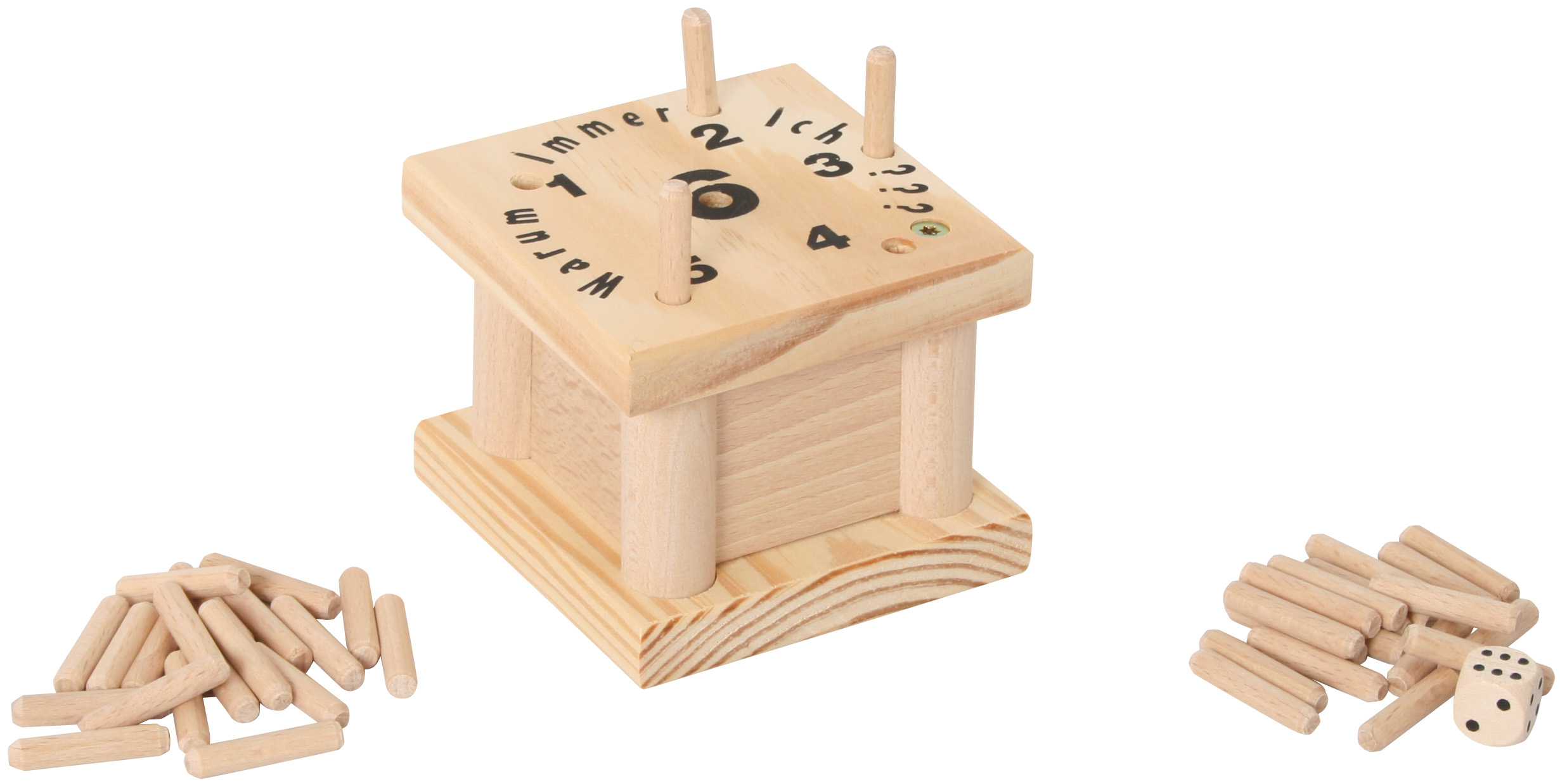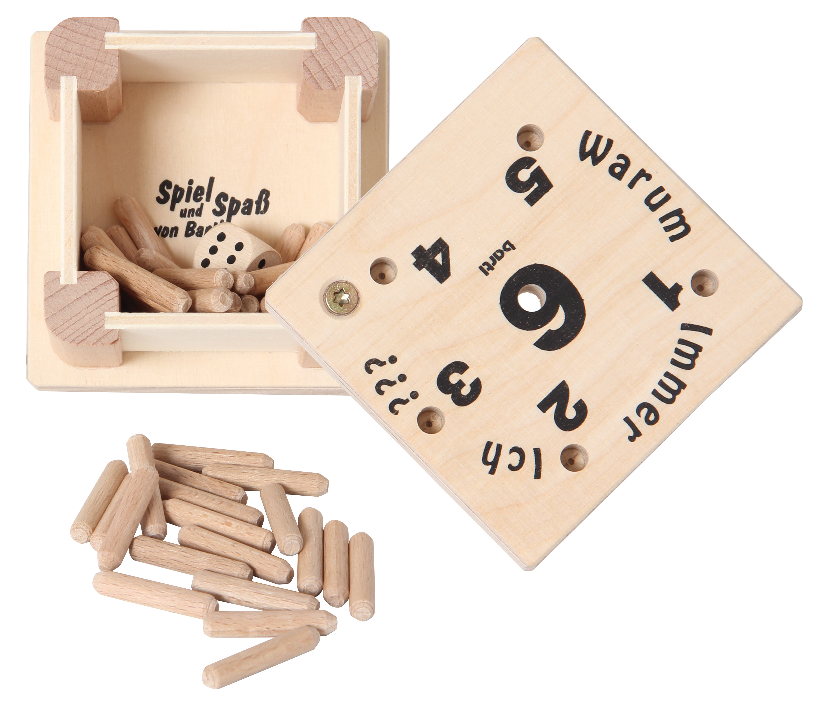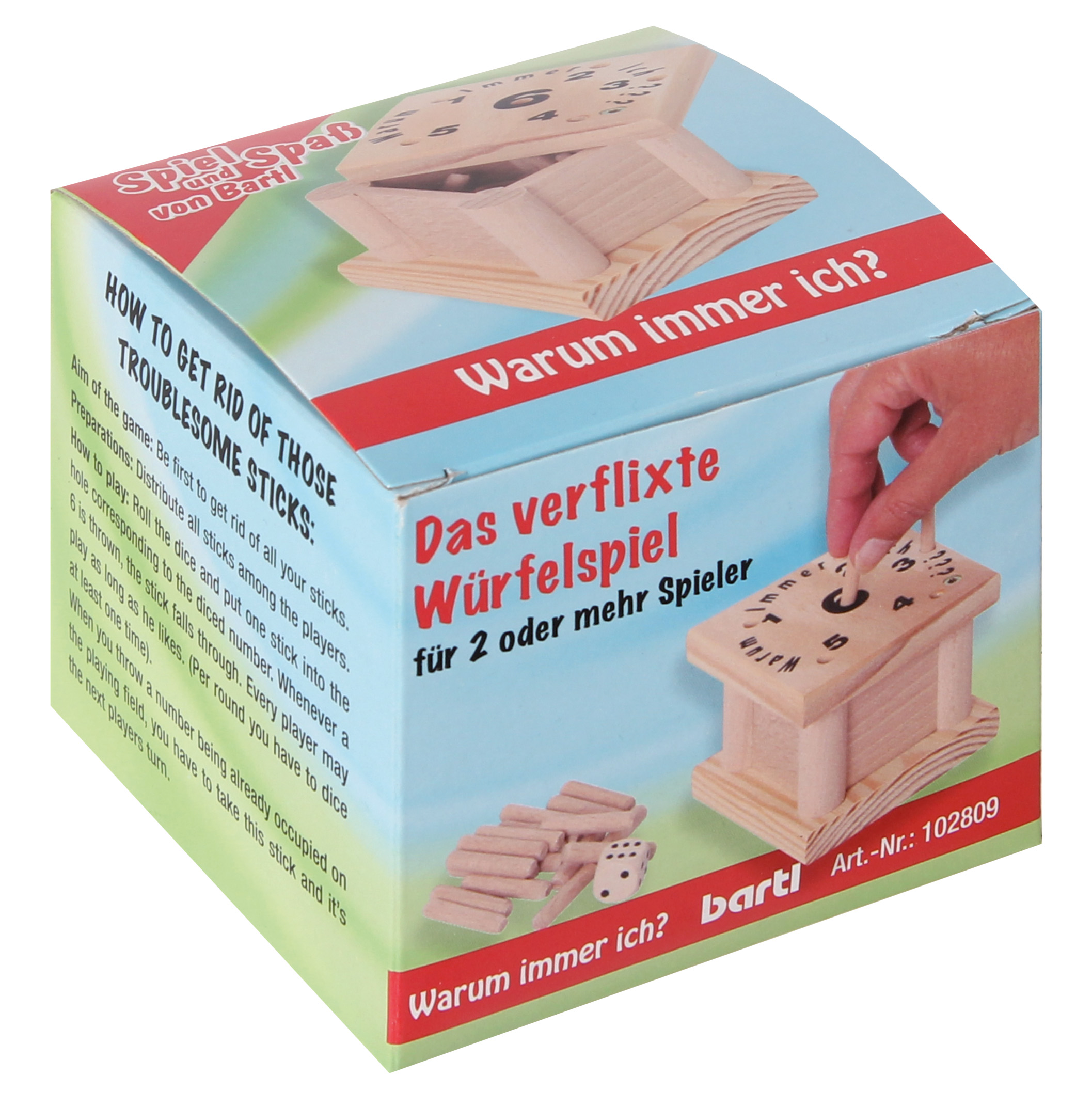 Beliebtes Würfelspiel für zwei und mehr Personen jeden Alters. So geht es: Alle Holzstäbe werden an die Spieler verteilt. Würfelnd werden die Felder des Spielbretts entsprechend der Augenzahlen besetzt. Bei 6 fällt das Stäbchen durch. Ist ein Feld bereits besetzt, muss der Spieler den Stab nehmen, und der Nächste ist dran. Wer keine Holzstäbe mehr hat, gewinnt. Und bald werden Sie wissen, warum das Spiel Warum immer ich? heißt!
