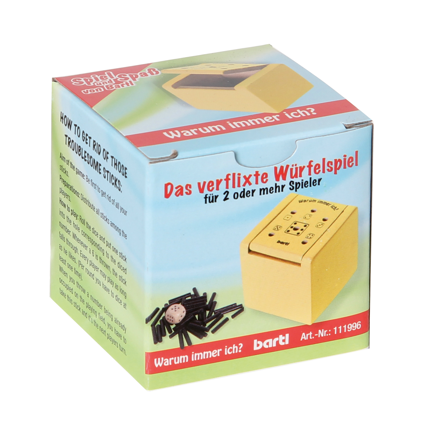 Beliebtes Würfelspiel für zwei und mehr Personen jeden Alters. So geht es: Alle Holzstäbe werden an die Spieler verteilt. Würfelnd werden die Felder des Spielbretts entsprechend der Augenzahlen besetzt. Bei 6 fällt das Stäbchen durch. Ist ein Feld bereits besetzt, muss der Spieler den Stab nehmen und der Nächste ist dran. Wer keine Holzstäbe mehr hat, gewinnt. Und bald werden Sie wissen, warum das Spiel Warum immer ich? heißt! Gefertigt aus Buchenholz, mit praktischem Magnetverschluß.
