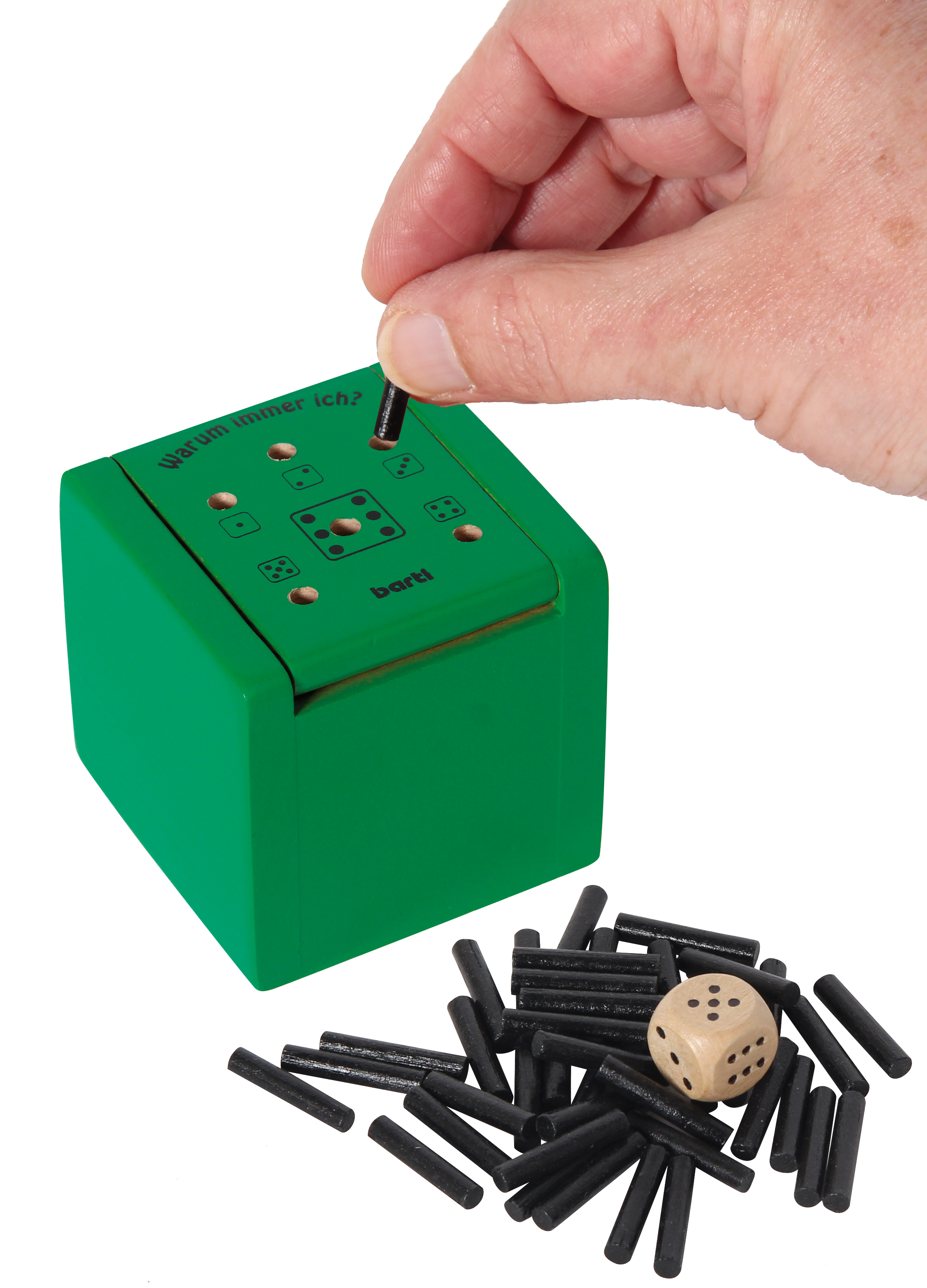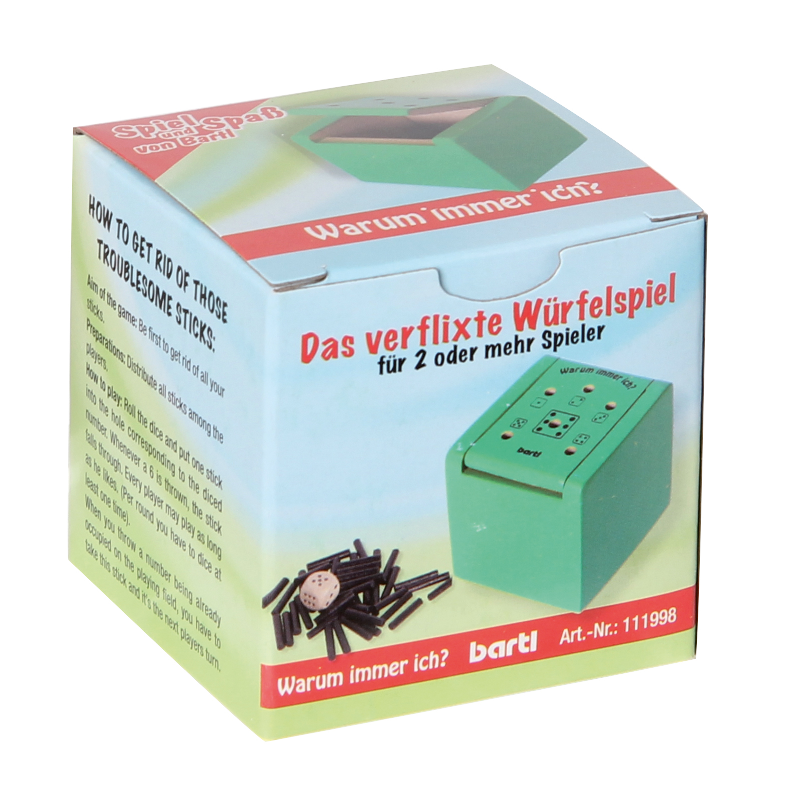 Beliebtes Würfelspiel für zwei und mehr Personen jeden Alters. So geht es: Alle Holzstäbe werden an die Spieler verteilt. Würfelnd werden die Felder des Spielbretts entsprechend der Augenzahlen besetzt. Bei 6 fällt das Stäbchen durch. Ist ein Feld bereits besetzt, muss der Spieler den Stab nehmen und der Nächste ist dran. Wer keine Holzstäbe mehr hat, gewinnt. Und bald werden Sie wissen, warum das Spiel Warum immer ich? heißt! Gefertigt aus Buchenholz, mit praktischem Magnetverschluß.