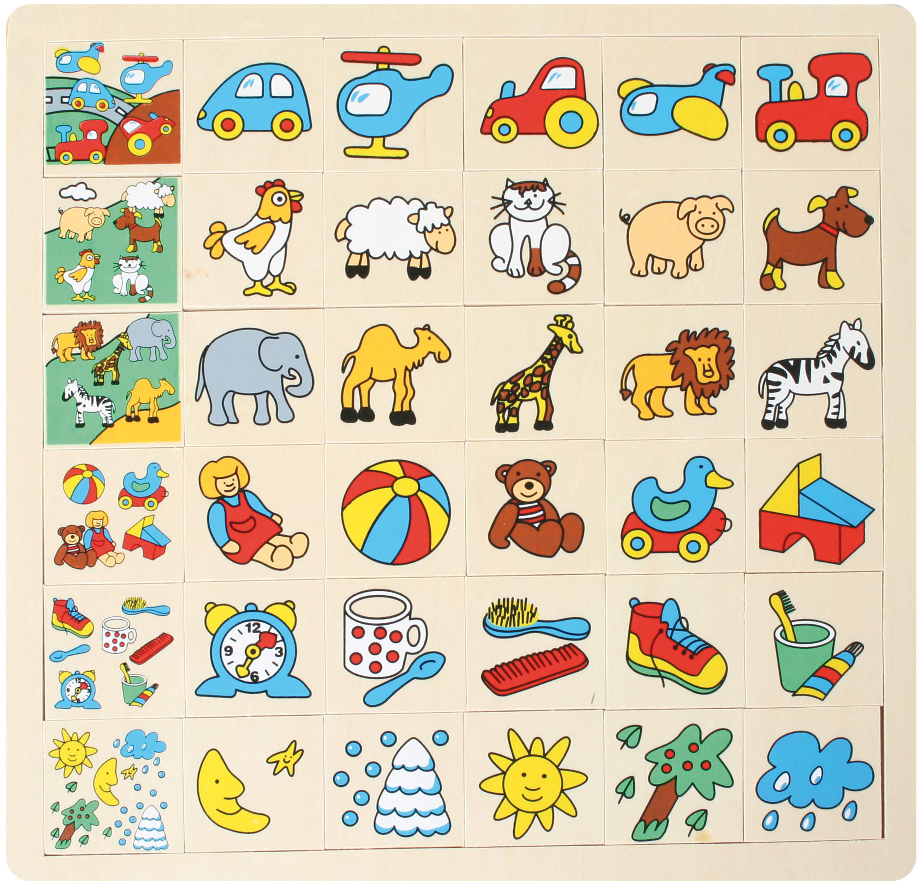 Aufgabe des Zuordnungsspieles ist es, jeweils die fünf Einzelbilder zu finden, die zu einem Szenenkärtchen passen. Dabei lernen Kinder ab 3, sich zu konzentrieren und üben Sprechen.