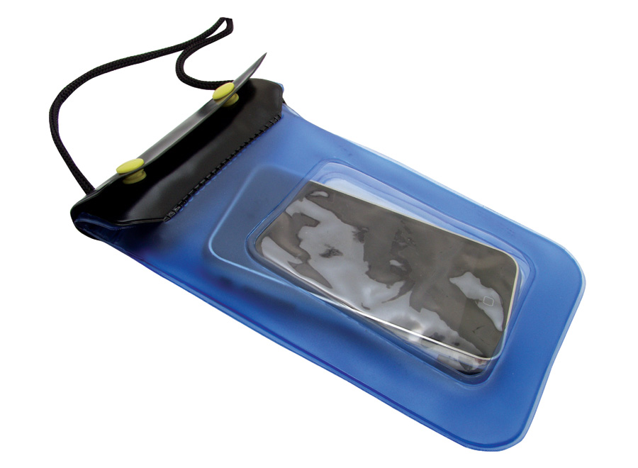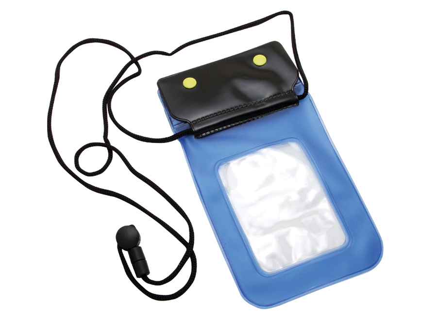 Wasserfester Beutel aus PVC in blau mit Sichtfenster. Verschließen mittels doppeltem Druckverschluss und 2 Druckknöpfen. Tragekordel.