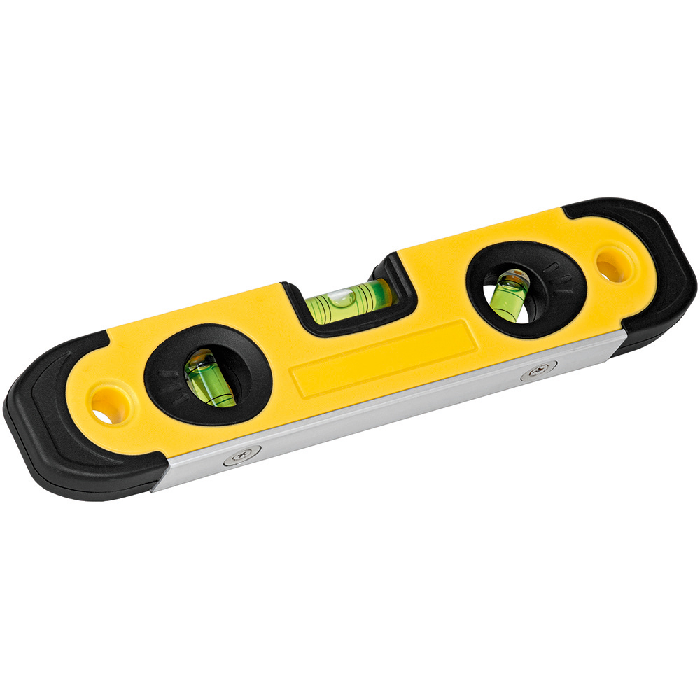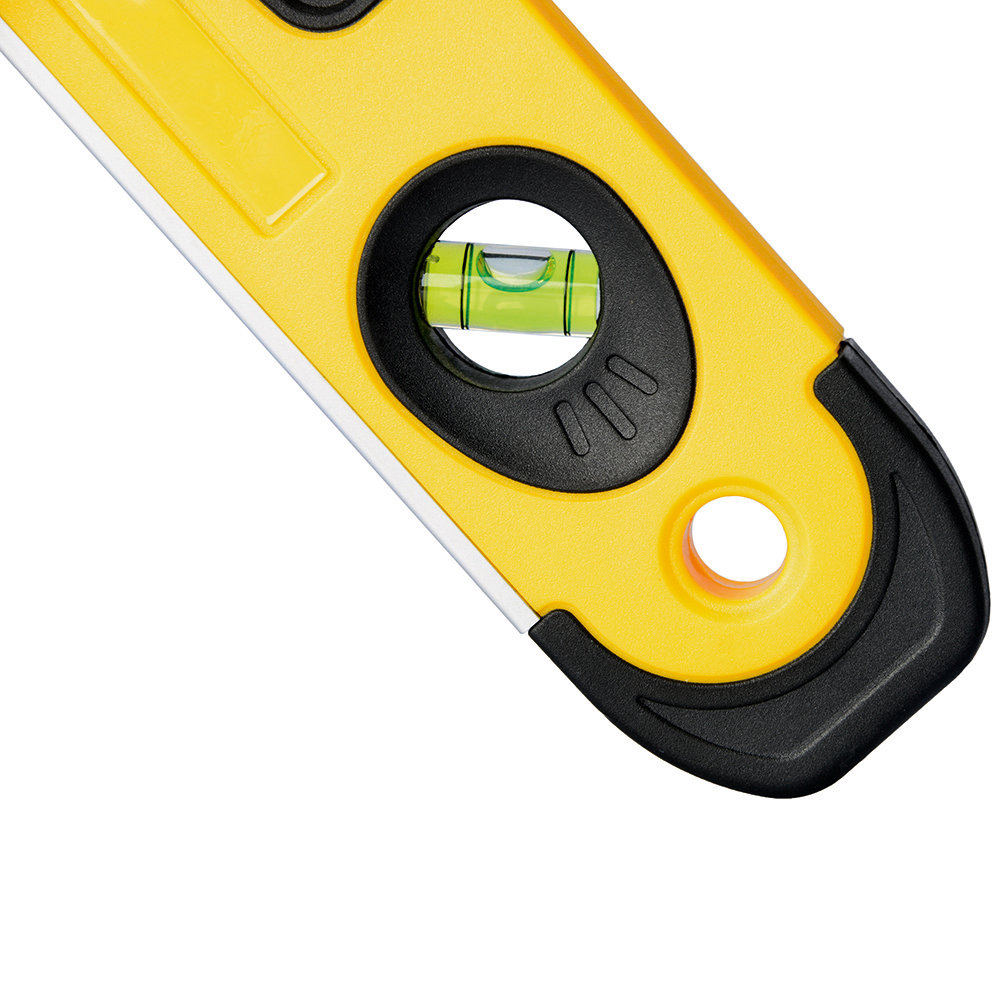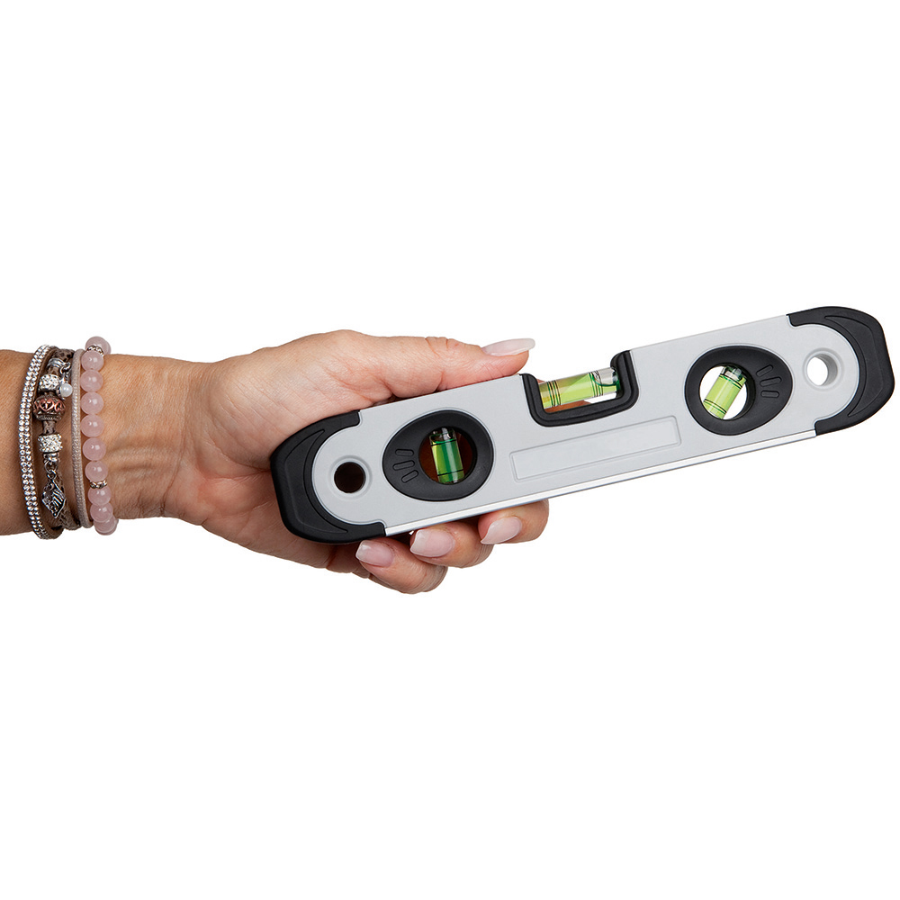 Wasserwaage aus ABS und TPR. Die horizontale Libelle verfügt zusätzlich über einen zweiten Ablesering zum Ausrichten für 1%-Neigungen. Die magnetische Messfläche verhindert das Wegrutschen auf metallischen Oberflächen und ermöglicht ein besseres Ausrichten mit freien Händen. Gehäuse: stoßfestes ABS mit TPR-Endkappen. Libellen: horizontal, vertikal, diagonal, mit 2 Ableseringen für 1%-Neigung. Messgenauigkeit: ± 1,0 mm / m. Ausstattung: TPR-Endkappen stoßdämpfend, Messfläche mit integrierten starken Magneten, Ösen. Verpackung: schwarze Geschenkverpackung.