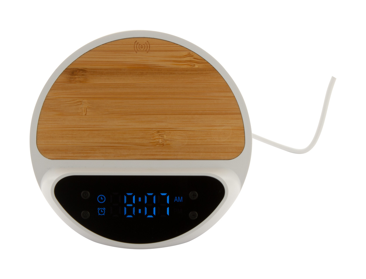 Digitaler Wecker im Gehäuse aus recyceltem ABS-Kunststoff und Bambus, mit Handyhalterung und integriertem WirelessFast-Charger (15 W). Inklusive USB-Ladekabel.