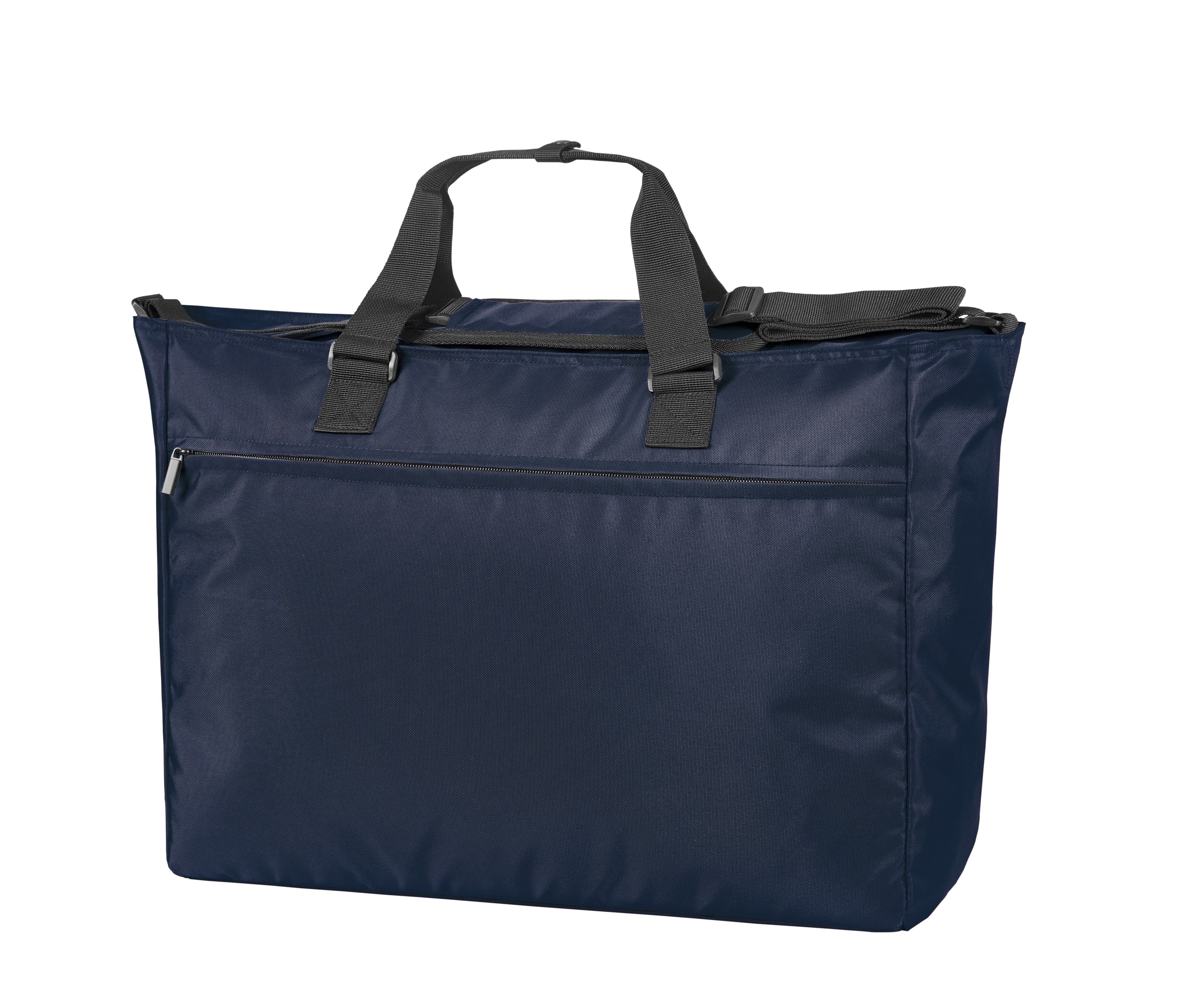 Moderner, leicht gepolsterter Weekender; rPET-Obermaterial; großes Hauptfach mit 2-Wege-Reißverschluss; Reißverschluss-Vortasche; flaches Reißverschlussfach innen; beidseitig längenverstellbarer Tragegurt mit genähtem Schulterpolster; Handgriffe mit Druckknopfmanschette