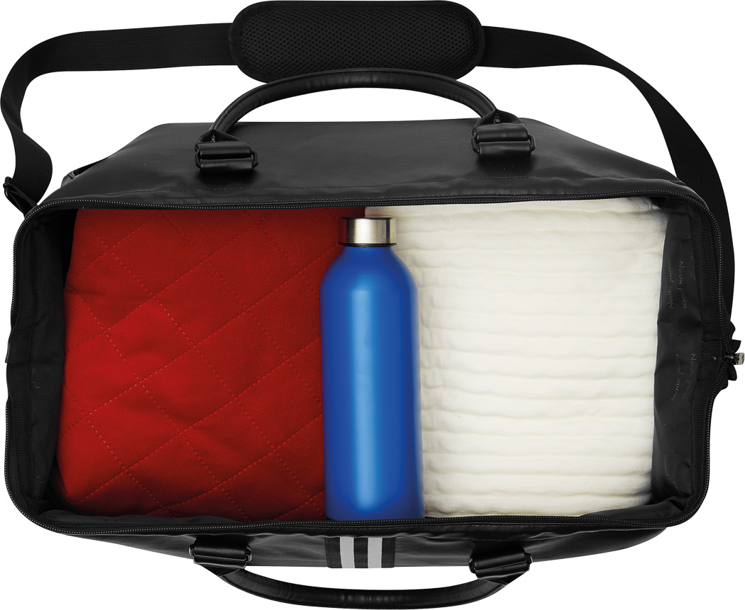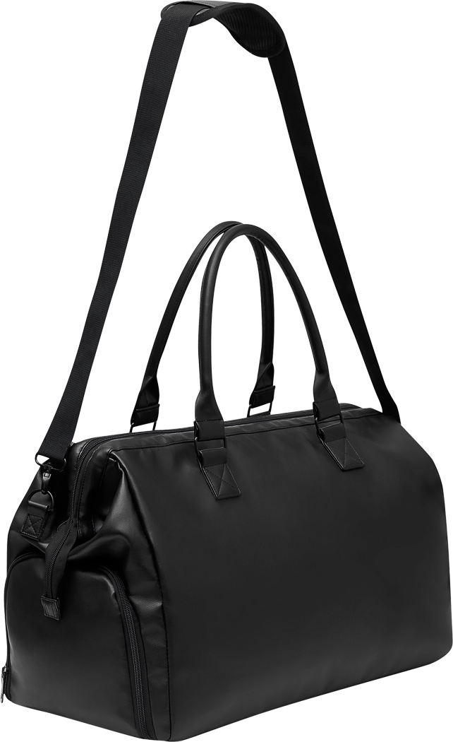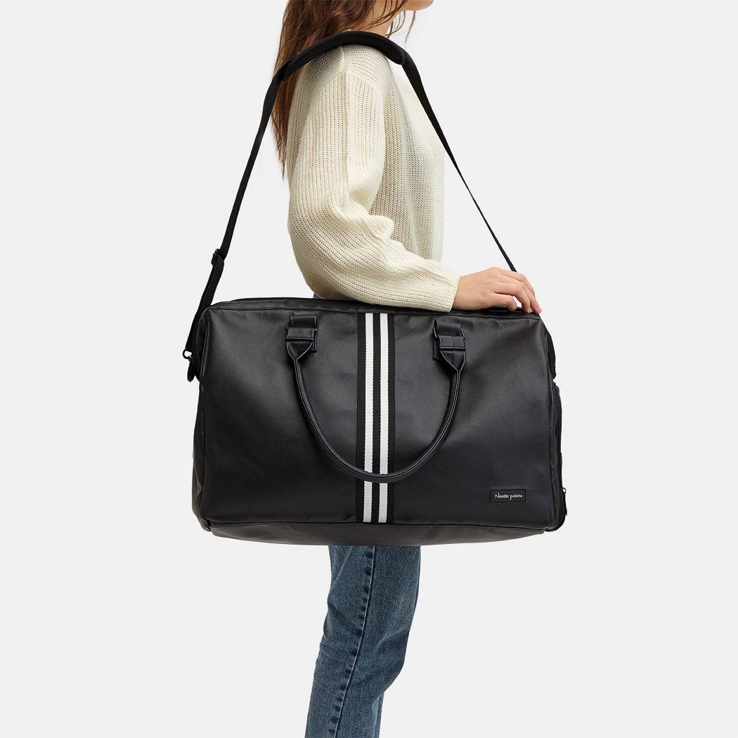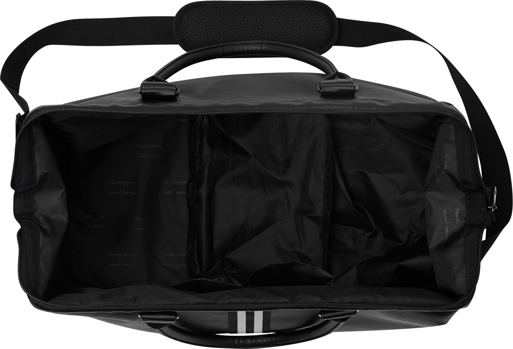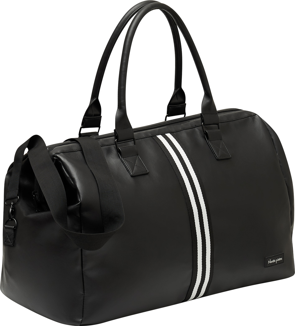 Weekender ROTTERDAM: aus hochwertigem Kunstleder gefertigt mit sportiver Streifen-Applikation im Frontbereich, geräumiges Hauptfach mit verstärkter Reißverschlussöffnung, die das Befüllen erleichtert, verstärkter Boden, 1 seitliches Reißverschluss-Schuhfach, 2 gepolsterte Tragegriffe, verstell- und abnehmbarer Schultergurt mit Schulterpolster, innen 1 Reißverschlussfach und 2 Steckfächer, ein Produkt der Marke Nordic plains