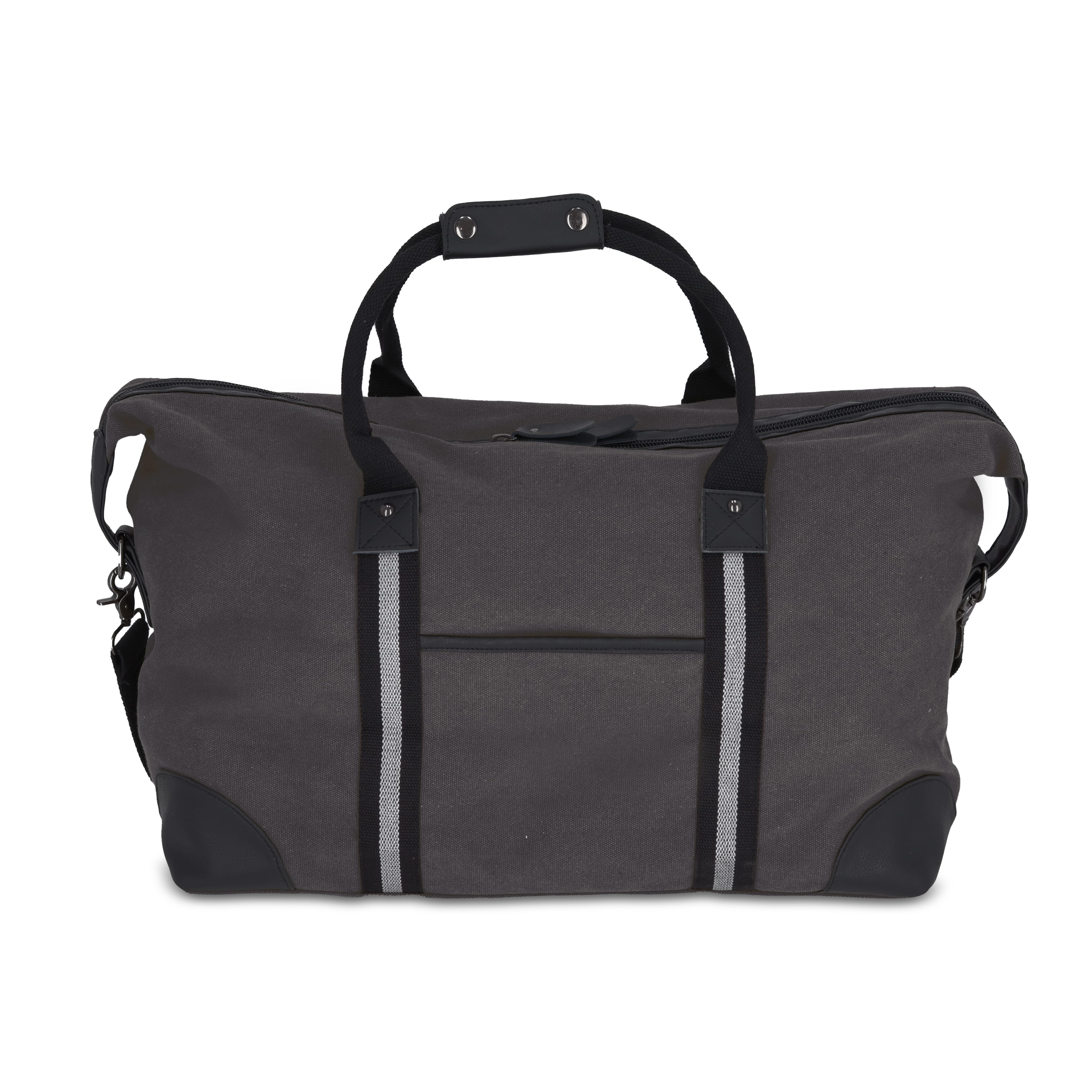 Elegante Weekender-Tasche aus recyceltem Baumwoll-Canvas. Mit 100% recyceltem, reflektierendem Gurtband, luxuriösen Reißverschlüssen und Griffen sowie einem Futter aus 100% recyceltem Polyester. Mit verstellbarem, abnehmbarem Schultergurt, 1 Fronttasche und 2 Innentaschen, eine davon mit Reißverschluss.