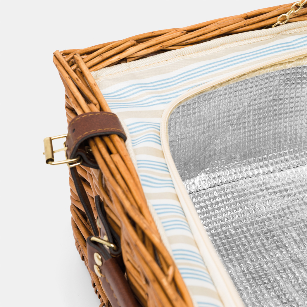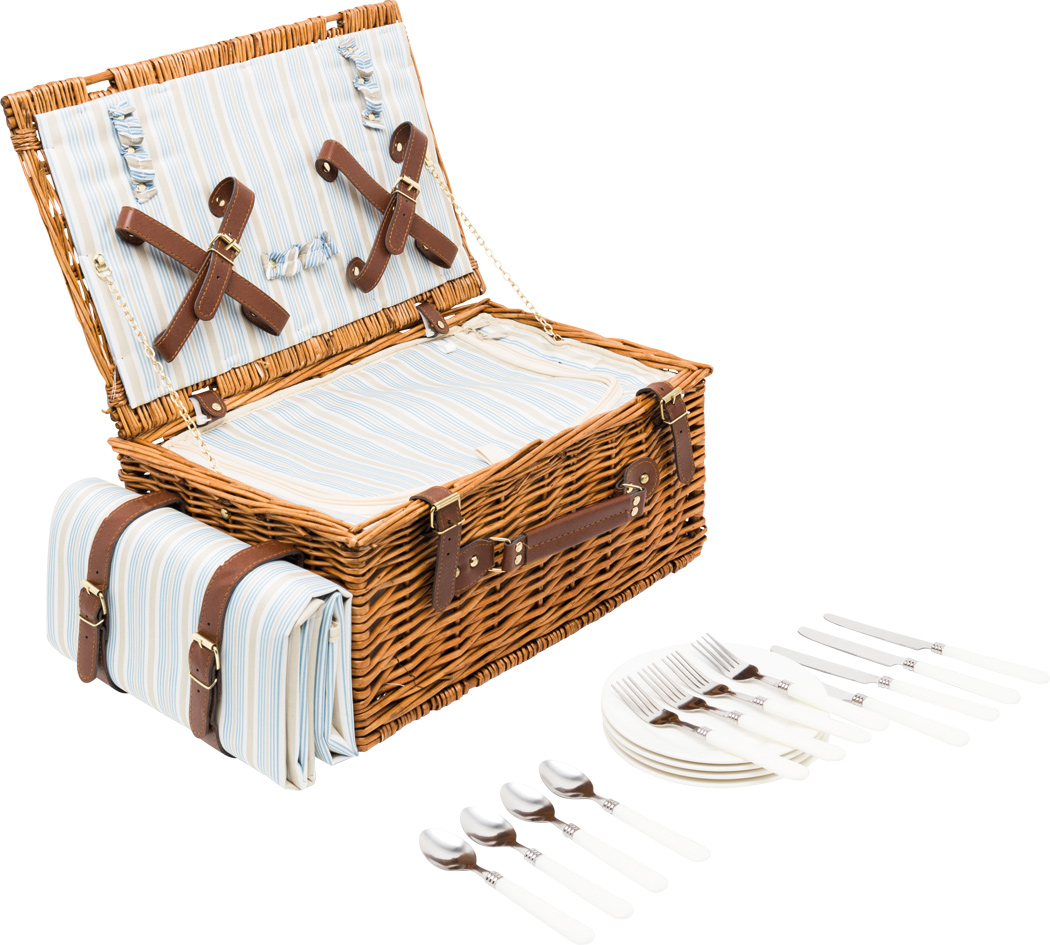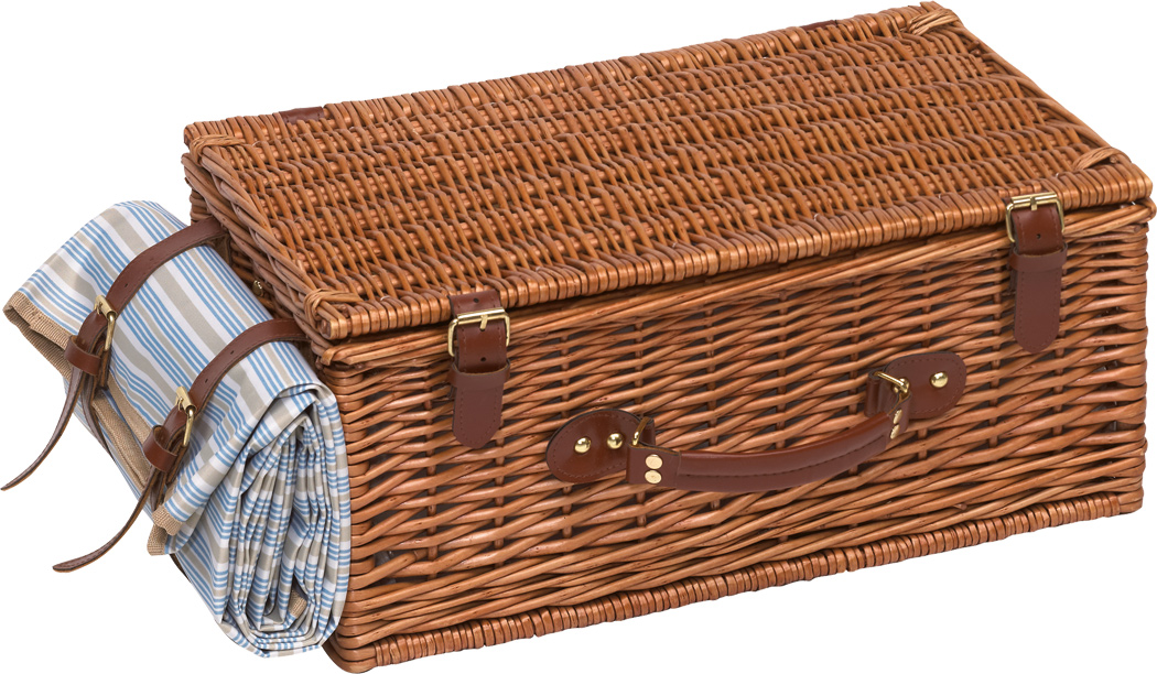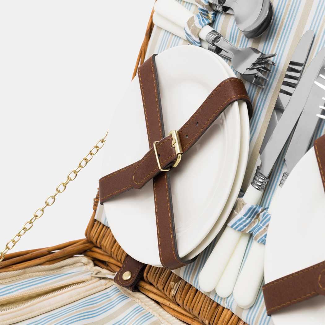 Weiden-Picknickkorb MADISON PARK für 4 Personen: isoliertes Reißverschluss-Kühlfach, inkl. Edelstahl-Besteck mit Kunststoffgriffen, Tellern aus Keramik (innen mit Befestigungsgurten gesichert) und Picknickdecke mit beschichteter, schmutzabweisender Ober- und Unterseite (außen mit Befestigungsgurten gesichert), außen mit Tragegriff und Gurten zum Verschließen