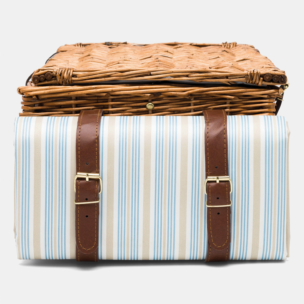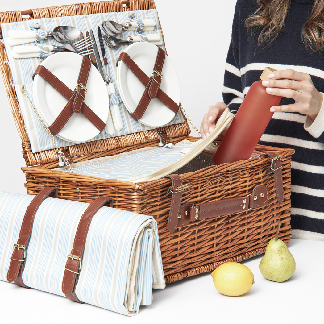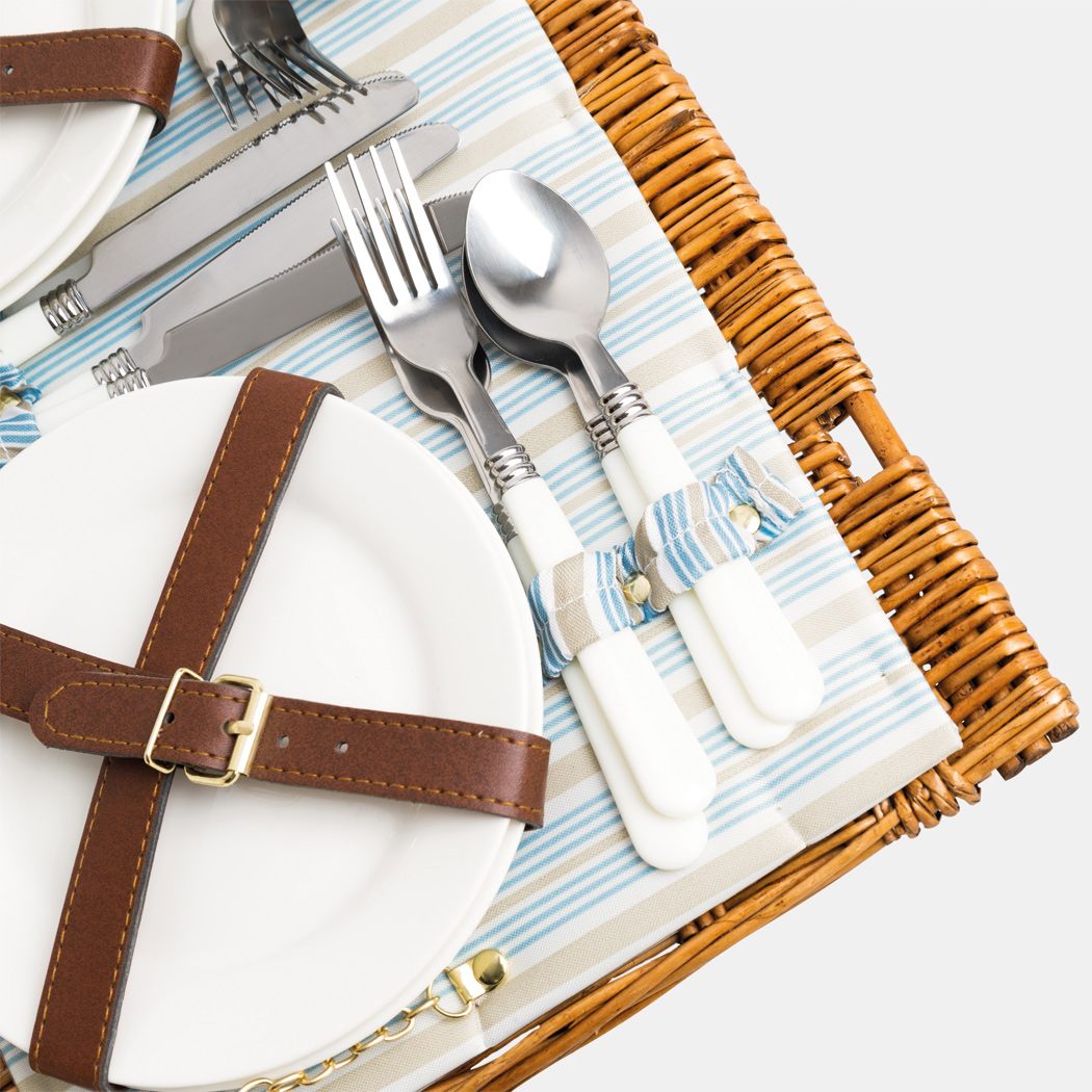 Weiden-Picknickkorb MADISON PARK für 4 Personen: isoliertes Reißverschluss-Kühlfach, inkl. Edelstahl-Besteck mit Kunststoffgriffen, Tellern aus Keramik (innen mit Befestigungsgurten gesichert) und Picknickdecke mit beschichteter, schmutzabweisender Ober- und Unterseite (außen mit Befestigungsgurten gesichert), außen mit Tragegriff und Gurten zum Verschließen