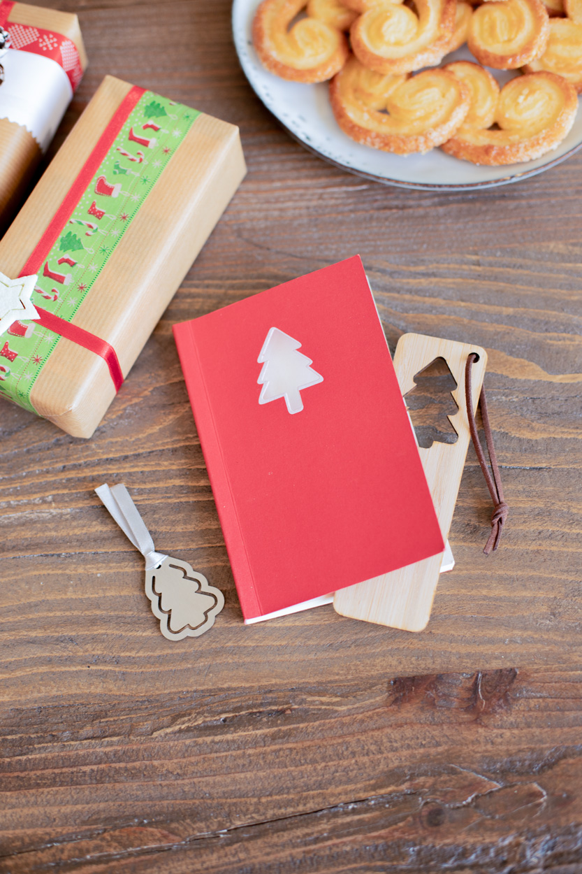Lesezeichen aus Bambussperrholz mit gestanztem Weihnachtsmotiv und PU-Lederband.
