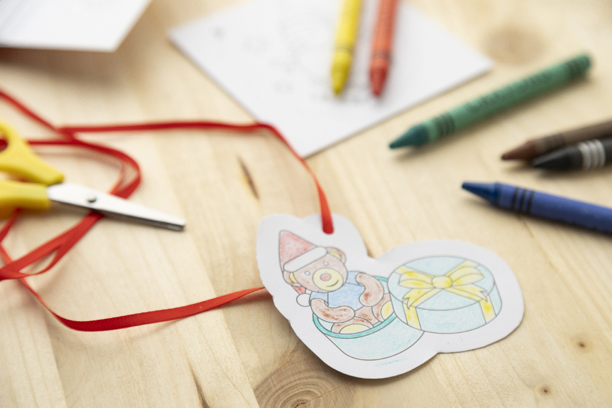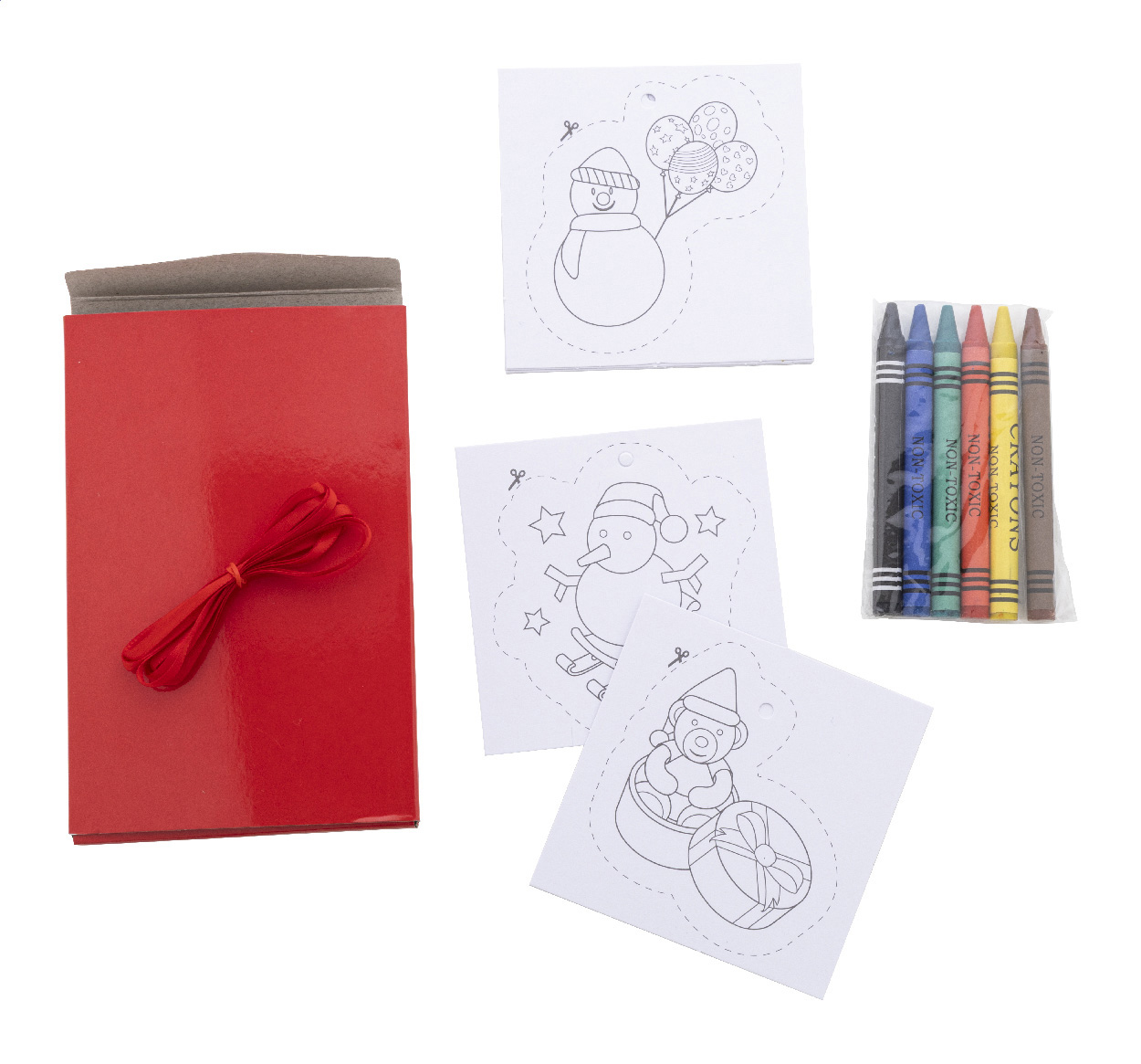 8-teiliges Weihnachtsmalset mit Papierornamentkarten, inklusive 6 Buntstiften und Aufhängebändern. In roter Papierbox.