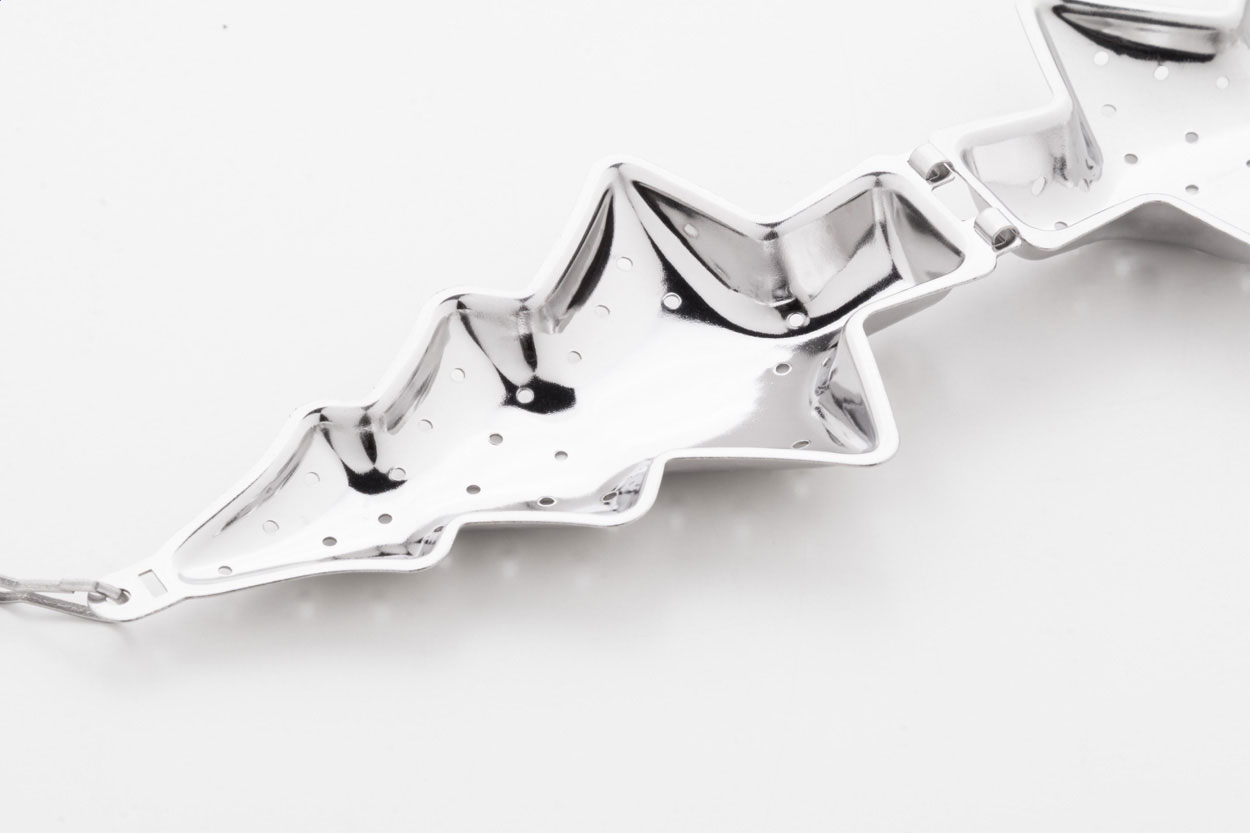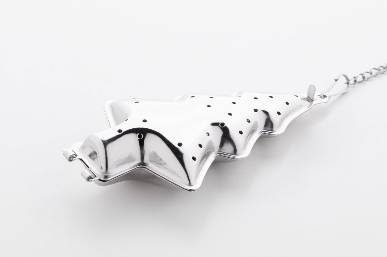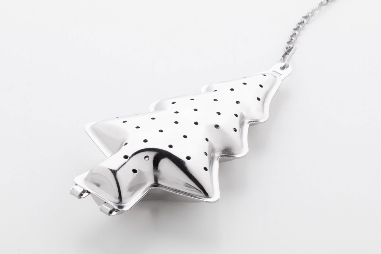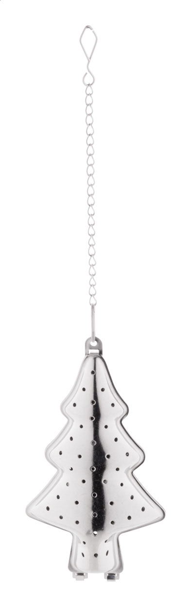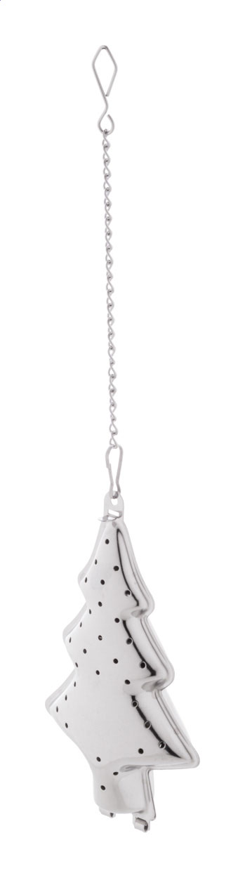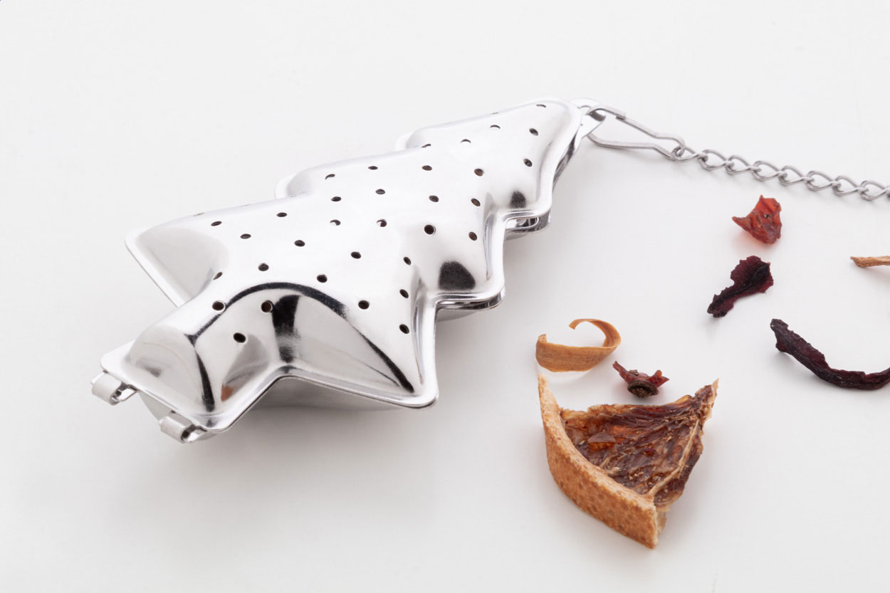Weihnachts-Tee-Ei aus Edelstahl mit Kette und Clip und bedruckbarer Fläche auf einer Seite.