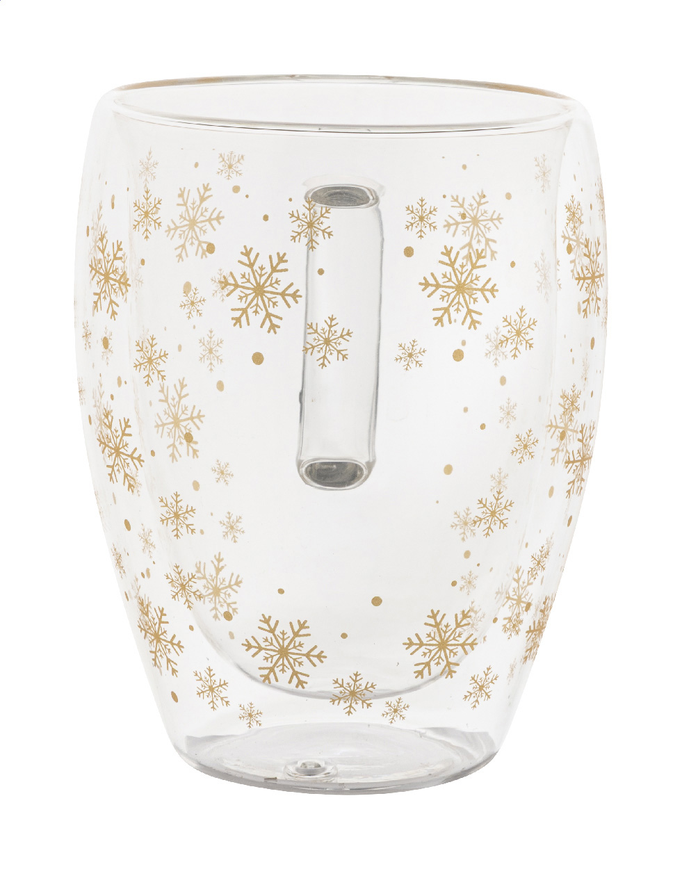Doppelwandiger Thermobecher aus Borosilikatglas mit weihnachtlichem Schneeflockendesign. Füllmenge: 350 ml. Einzeln in Kraftpapier-Box.