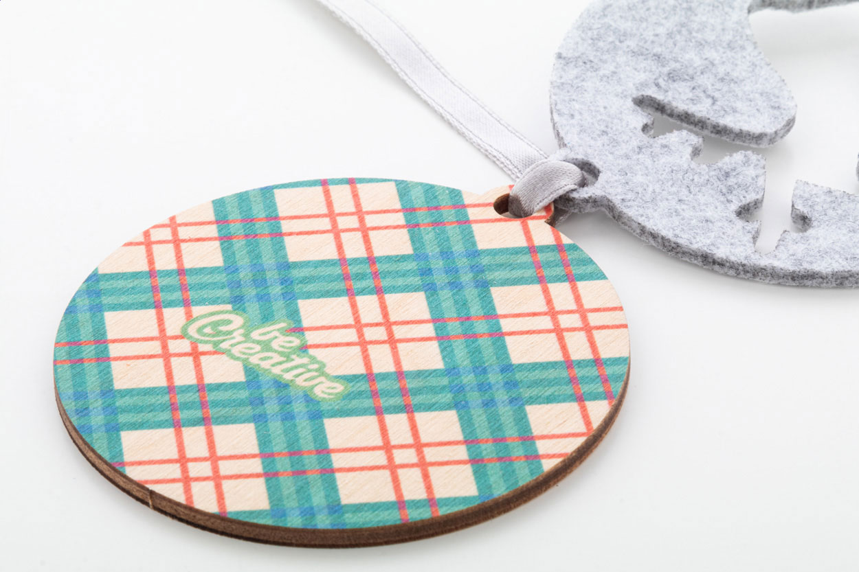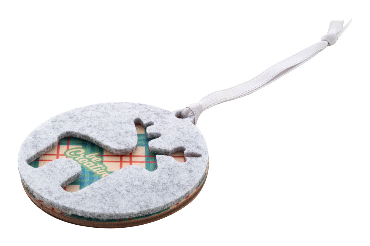 Individueller, zweilagiger Weihnachtsbaumanhänger aus RPET-Filz und Birkensperrholz mit silberner Schleife und gestanztem Weihnachtsmotiv. Der Preis ist inklusive UV-LED-Druck auf dem Holzteil. Mindestmenge: 100 Stk.