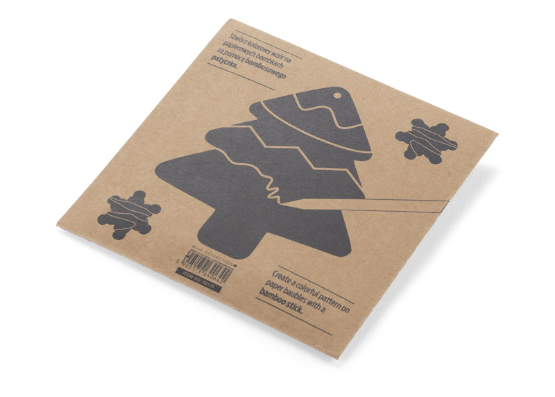 Weihnachtsbaum-Anhänger-Set. Mit Hilfe eines Bambusstabes können Sie auf einfache und unterhaltsame Weise Ihre eigenen außergewöhnlichen und einzigartigen Kugeln gestalten. Das Set enthält 4 Formen: eine Glocke, einen Stern, einen Weihnachtsbaum und einen Schneemann. Hergestellt aus Papier. Verpackt in einem braunen Umschlag.