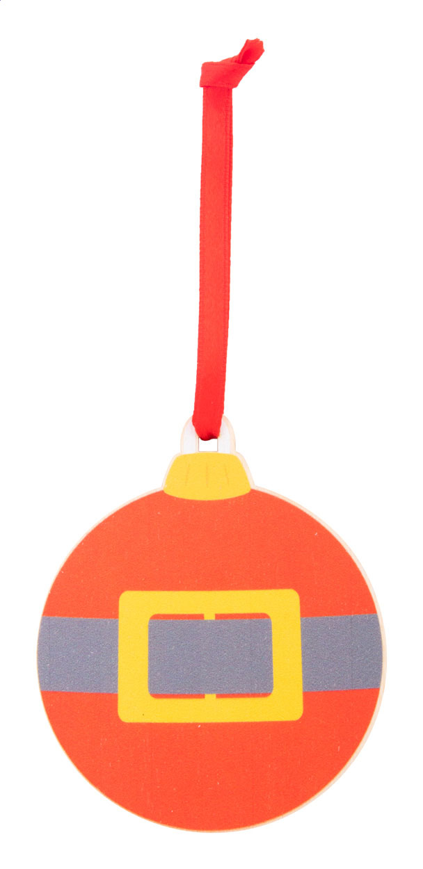 Weihnachtsbaumschmuck aus Birkensperrholz, mit aufgedrucktem Weihnachtsmotiv und rotem Band (separat beiliegend).
