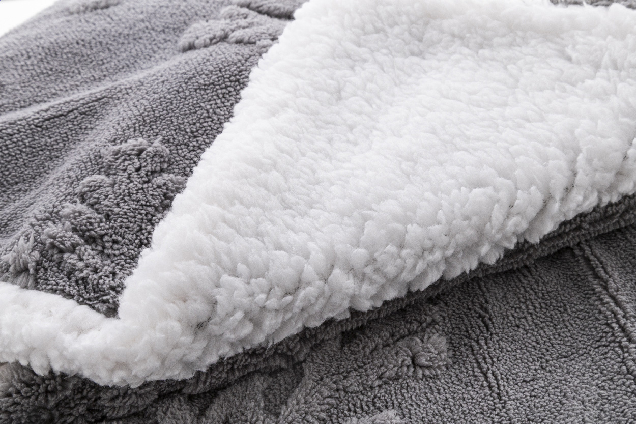 Hochwertige doppellagige RPET-Weihnachtsdecke mit Jacquard-Schneeflockenmuster. Material: 260 g / m² RPET-Korallenfleece und wendbarem 210 g / m² RPET-Sherpafleece-Futter. Mit Schleife und bedruckbarer Geschenkkarte aus Papier.