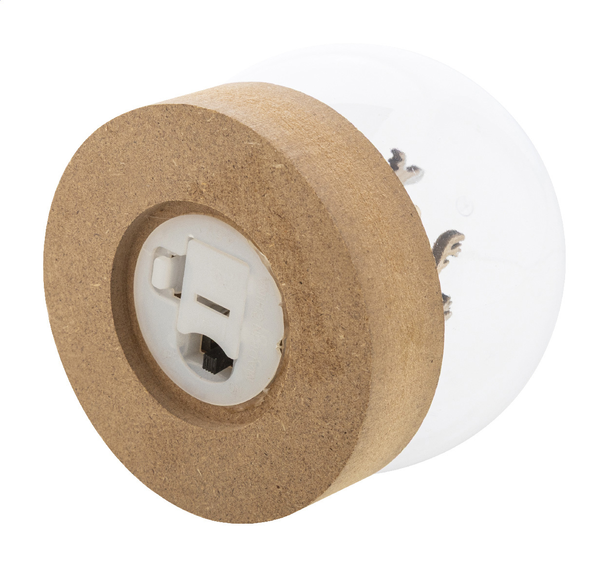 Beleuchtete Weihnachtsdekoration in Schneekugelform auf MDF-Holzsockel mit LED-Licht. Inklusive Knopfzellenbatterien. Mit Ein- / Ausschalter am Sockel.