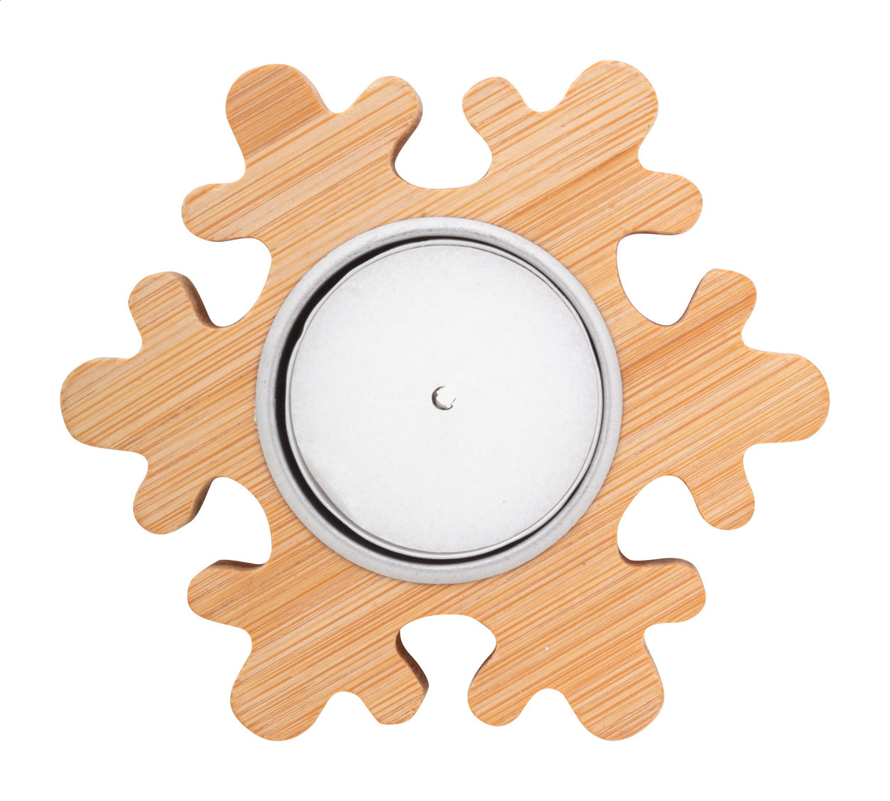 Weihnachtskerzenhalter aus Bambus mit Vanilleduft-Teelicht aus Pflanzenwachs. Brenndauer: 4 Stunden. Einzeln in Kraftpapierbox.