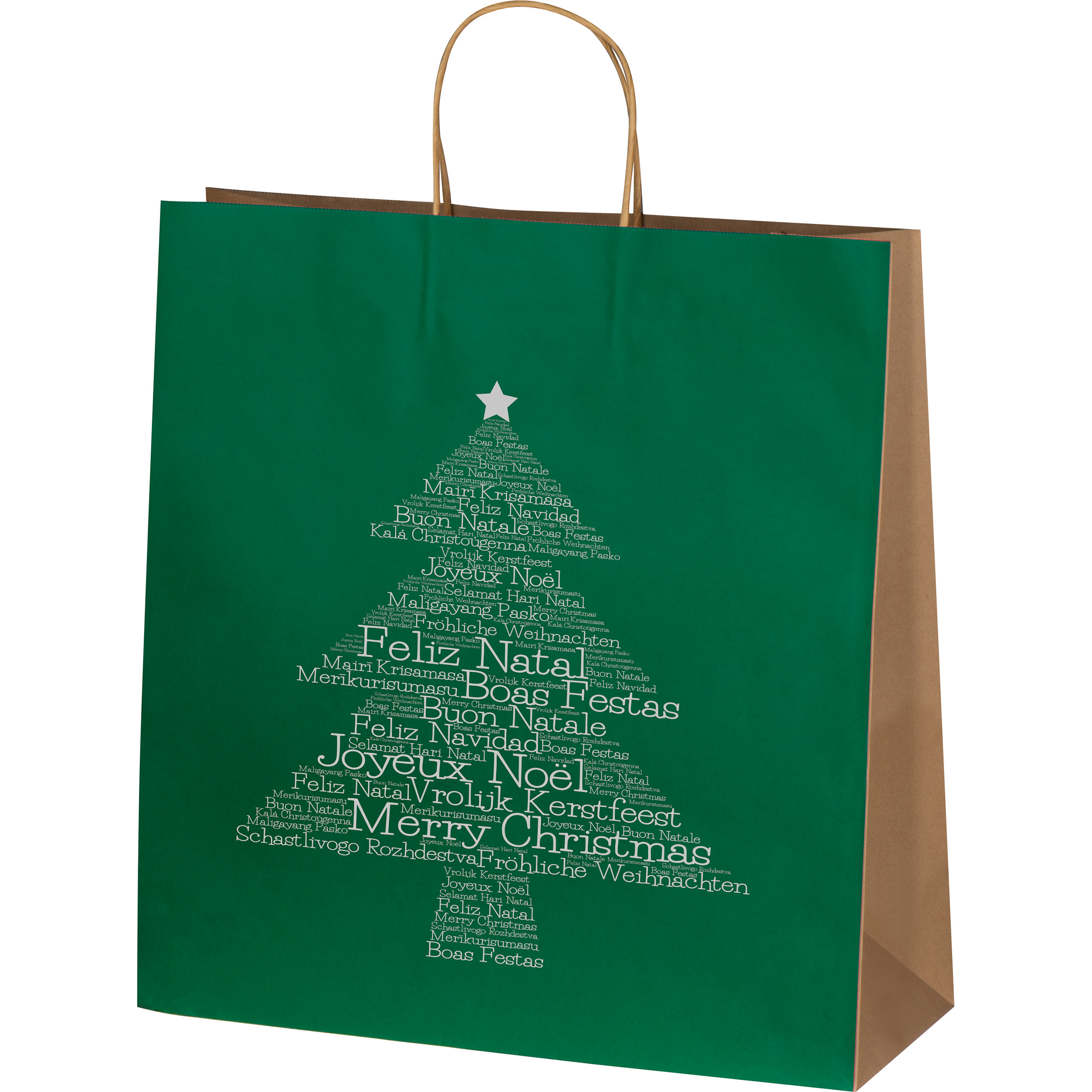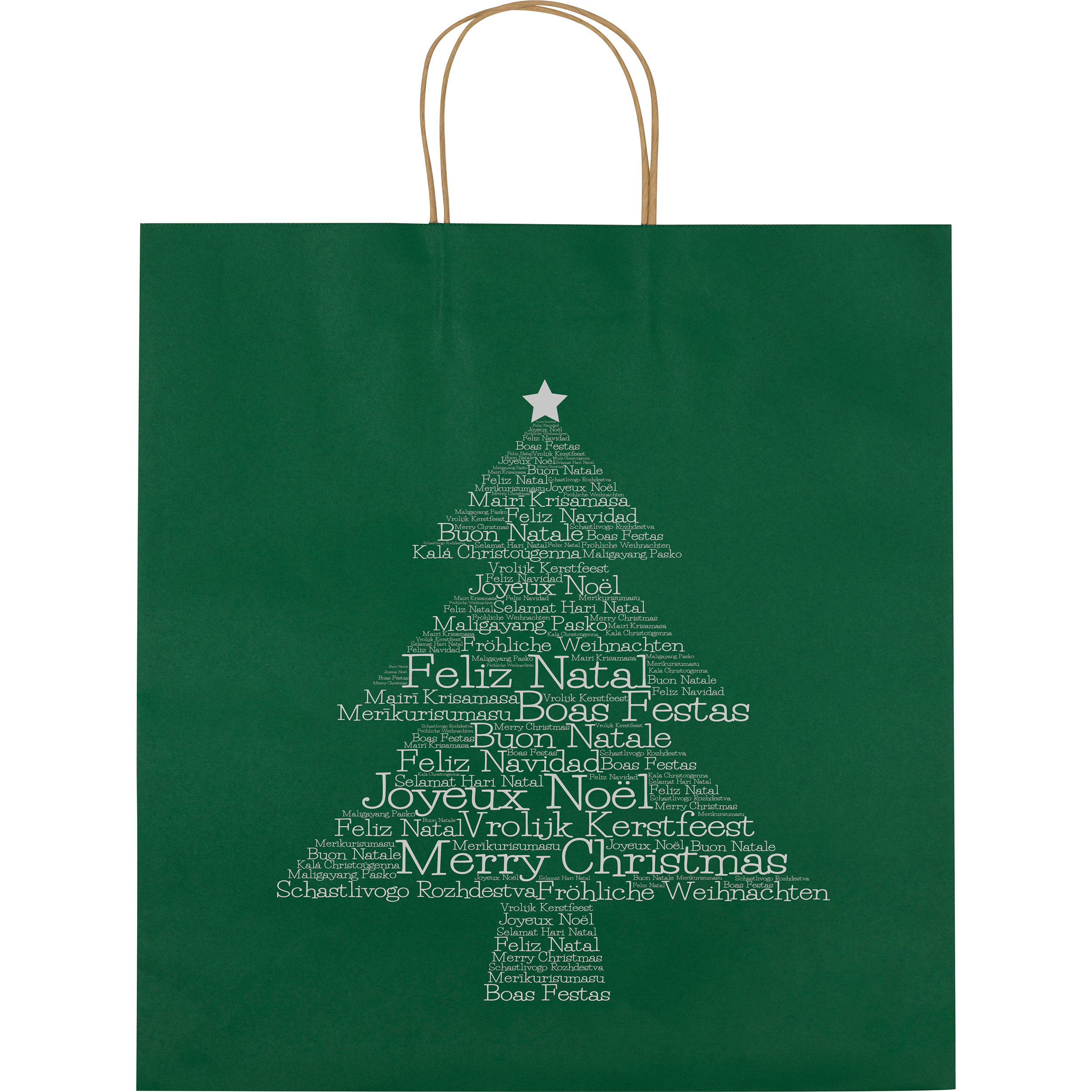 Große Weihnachtstasche aus recyceltem Papier mit weihnachtlichem Motiv. Ihre Werbung drucken wir auf die Rückseite.