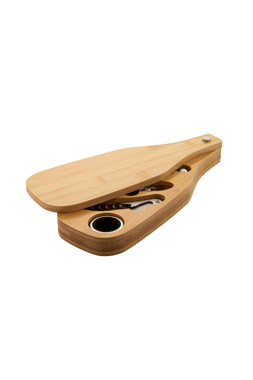 Weinset aus Edelstahl in einer flaschenförmigen Bambusbox, beinhaltet Korkenzieher, Tropfenstopper, Düse und Stopfen.