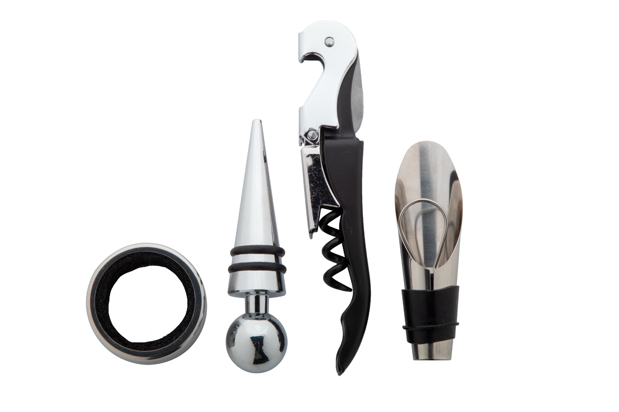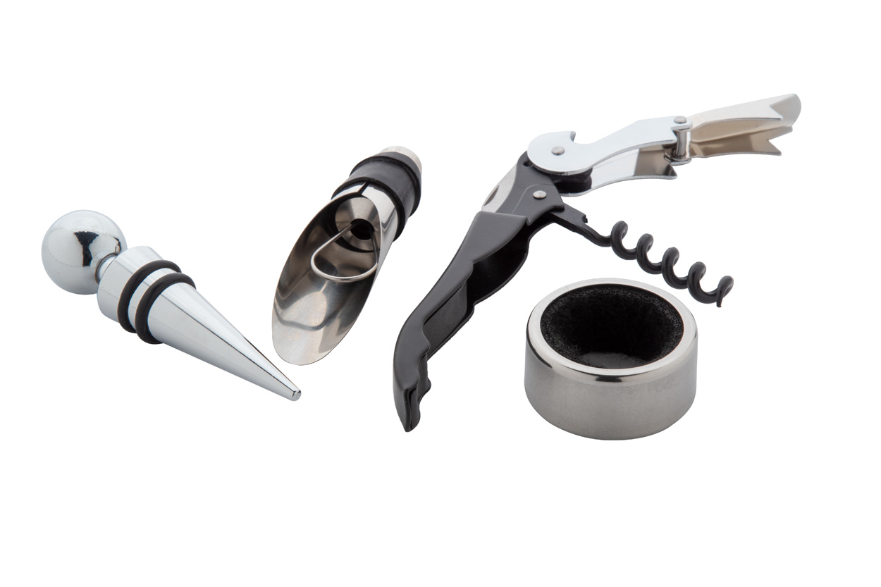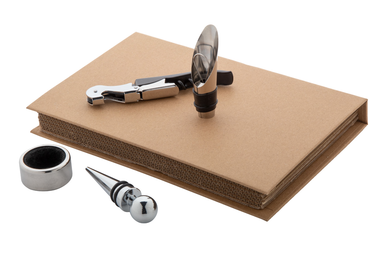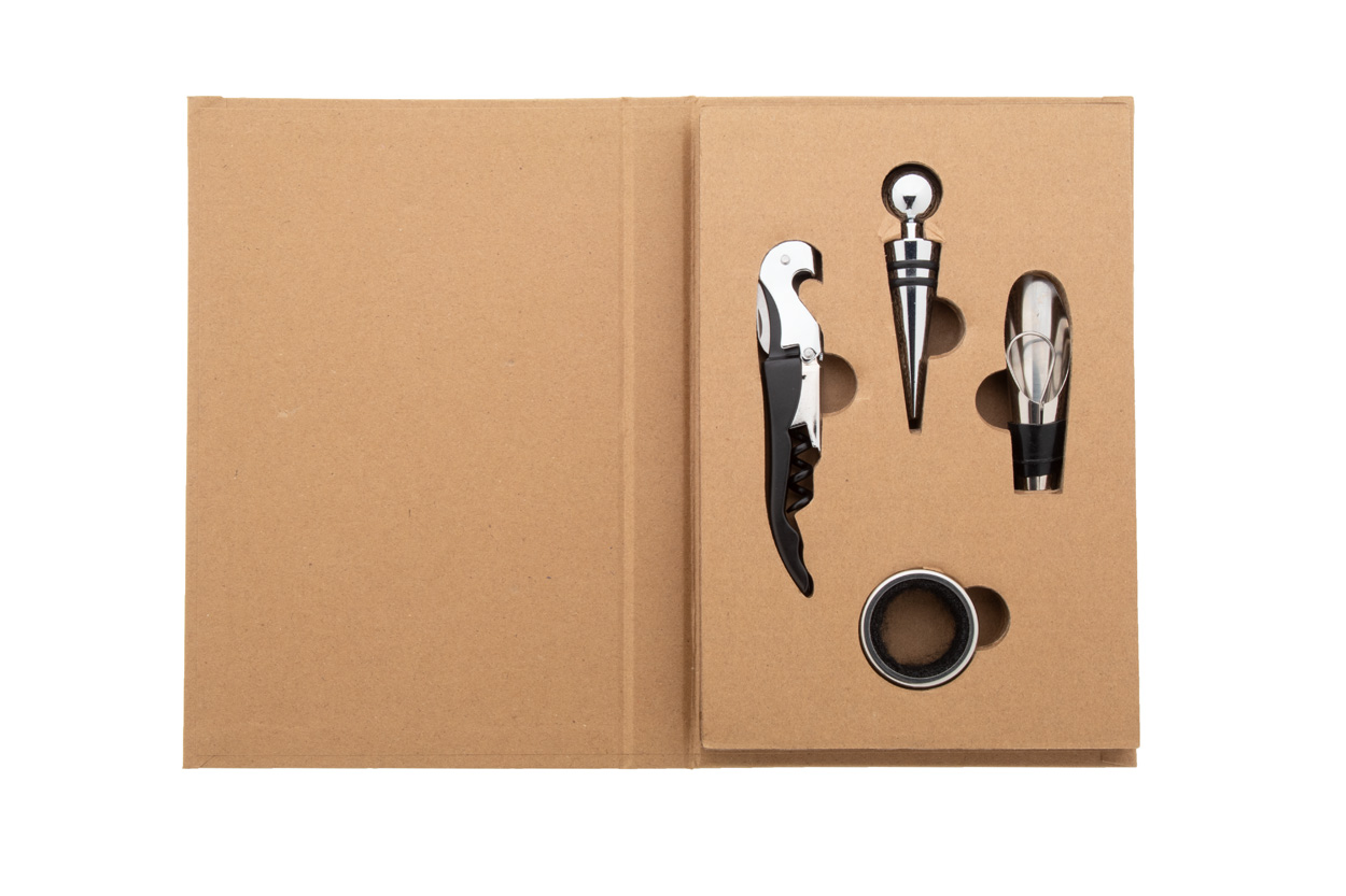 4-teiliges Weinset aus Edelstahl in einer buchförmigen Box aus recyceltem Kraftpapier. Inklusive Korkenzieher, Tropfenstopper, Düse und Stopfen.