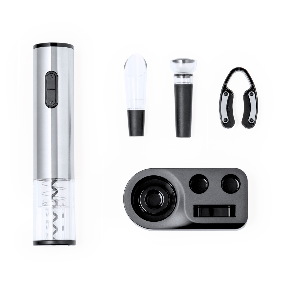 Praktisches Weinset mit 4 Zubehörteilen. Enthält einen elektrischen Korkenzieher mit 4 AAA-Batterien (nicht im Lieferumfang enthalten), eine Karaffe, einen Deckel und einen Kapselschneider mit Aufsteckmechanismus. Inklusive einer eleganten schwarzen Basis, um die Accessoires ordentlich aufzubewahren. Präsentiert in einer Kraft-Design-Box.
