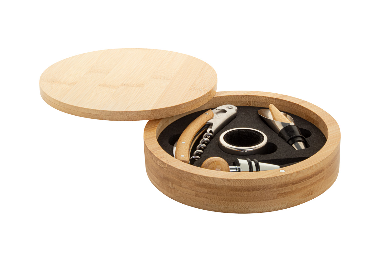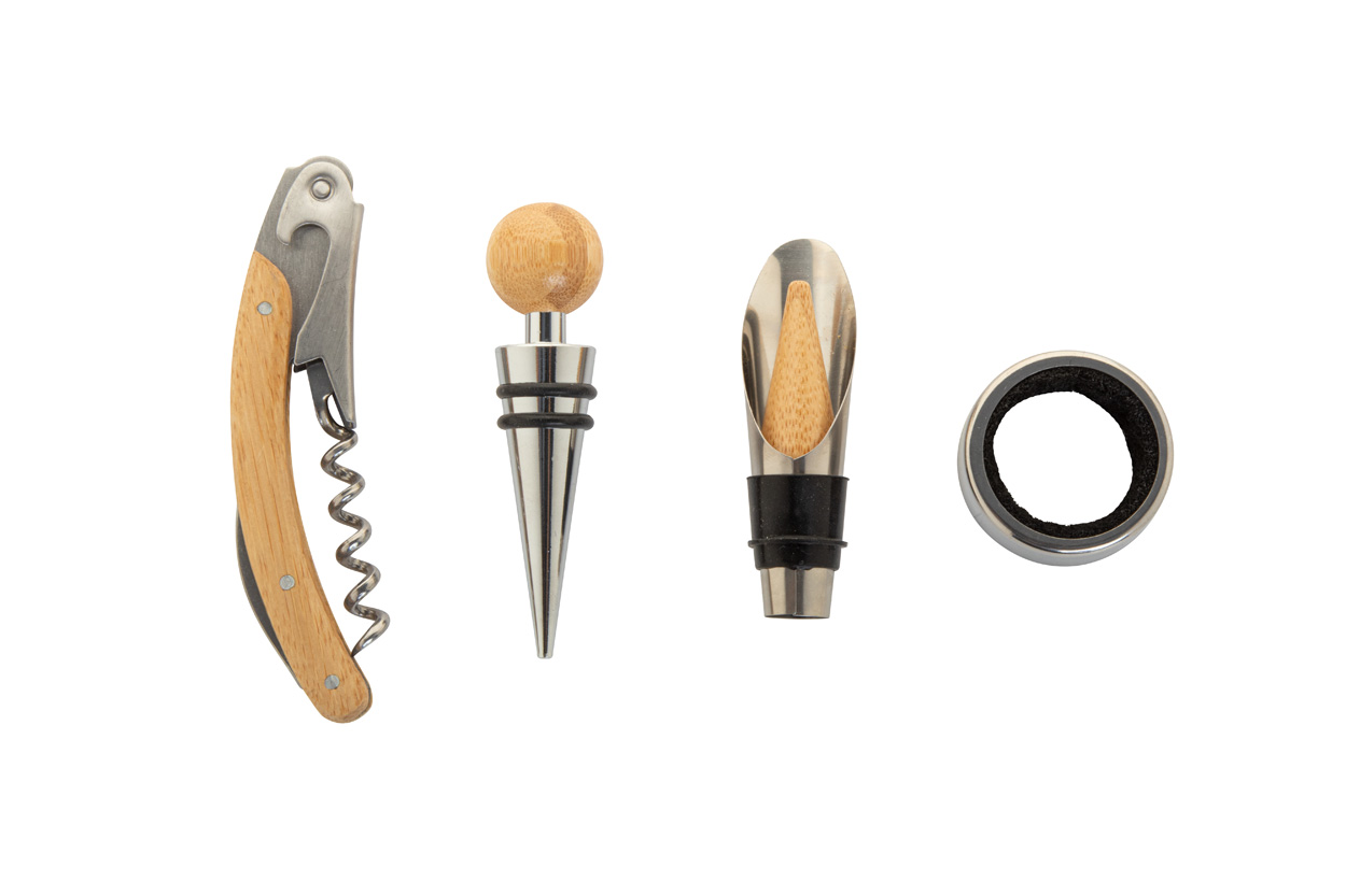 4-teiliges Weinset aus Edelstahl mit Bambuseinlage in runder Bambusbox. Inklusive Korkenzieher, Tropfenstopper, Düse und Stopfen.